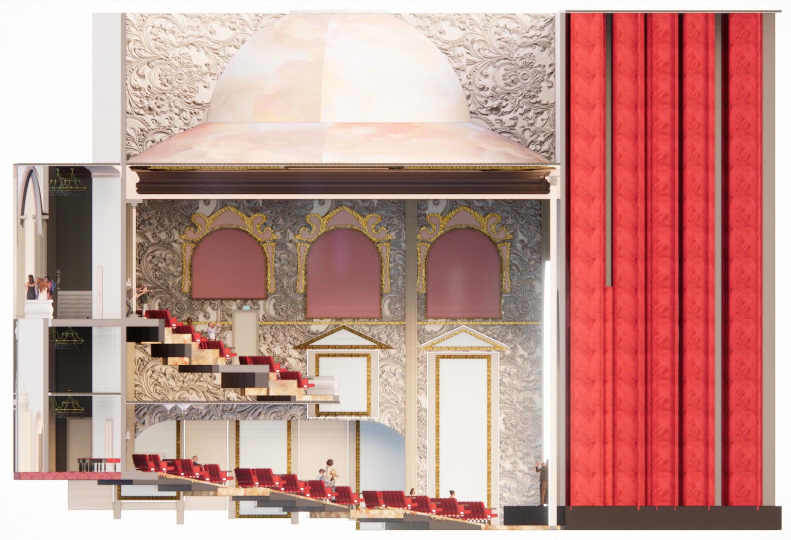 The Alithini Theater is a historic theater that offers a variety of uses for the performing arts. Neoclassic Revival style is demonstrated through strong architectural columns and artistic balance of soft colors and ornate gilding. Low hanging ceilings compress the occupant’s visual attention, then release into open volumes that allow for the eye to travel evenly throughout the room.