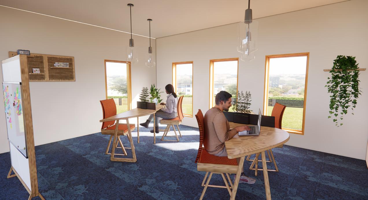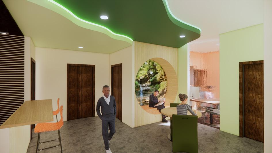 NEXT is a collaborative single profit company that prioritizes sustainability, cohesion, balance, and inclusion. This 11,000 square-foot space is designed using inspiration from local elements, including the Bluebonnet flower. The implementation of Human-Centric design is shown through use of Third Space, biophilic design, and inclusive design, which prioritizes employee wellness and productivity. Organic shapes, natural colors, and fluid mobility create an encompassing work environment.
