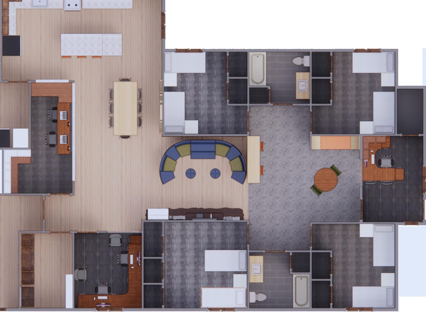 This group project combined the talents of Interior Design and Industrial Design students to create a cohesive, user-friendly space. Using inspiration from selected furniture dealing companies, we created our color palette and designed our furniture pieces according to our end users and their needs.