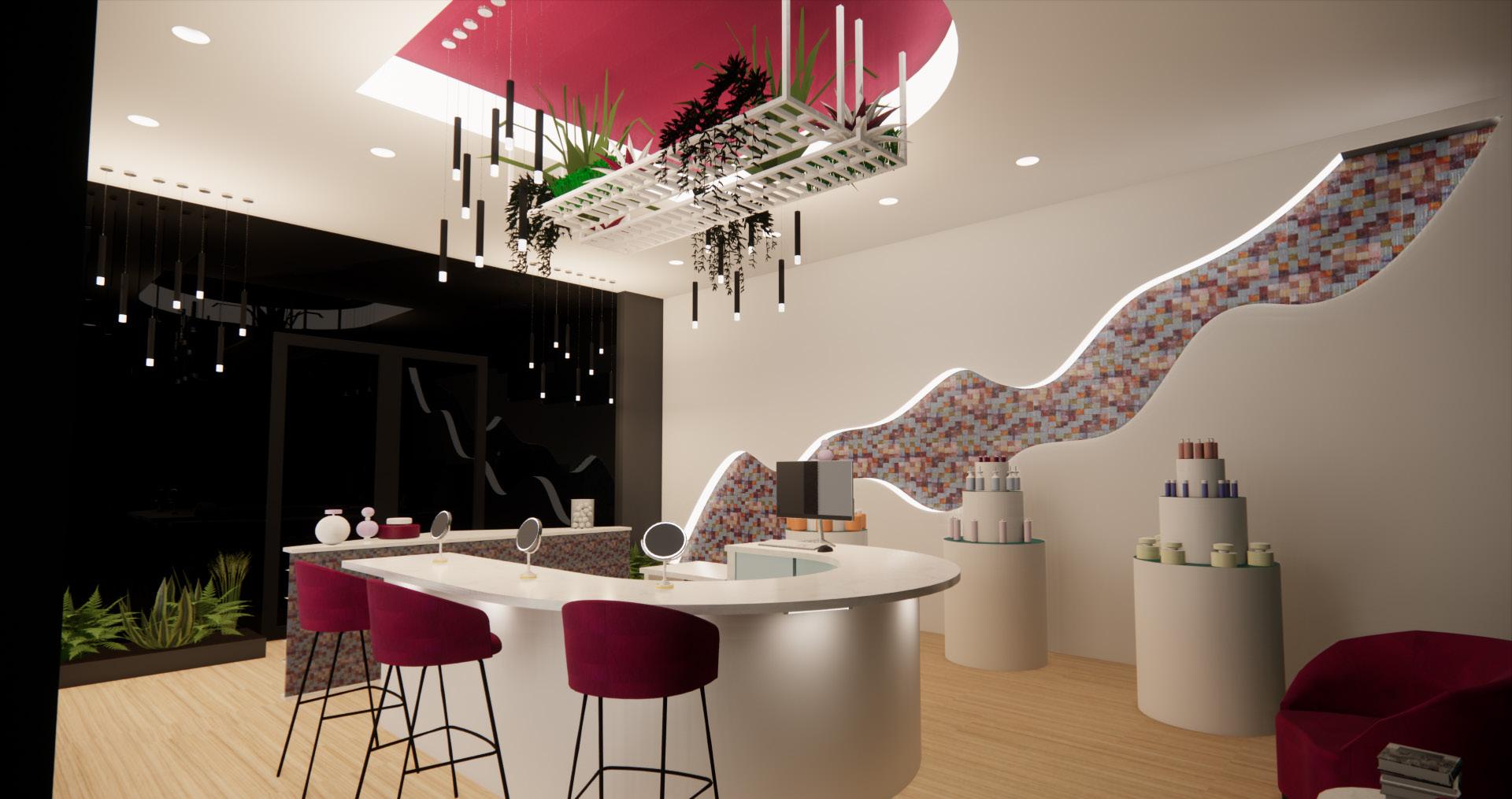 This clean, reflective retail space offers rejuvenating products and confidence to its customers. The valiant teals, pops of pink, and neutral tones and elements mimic the sophisticated energy of Chanel. Natural greenery and textures direct the eye throughout the space and offer a sense of familiarity against the bold colors and reflective light.