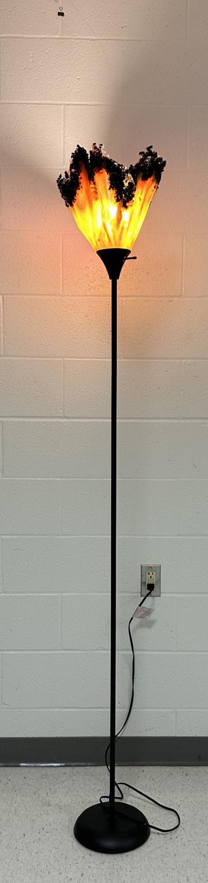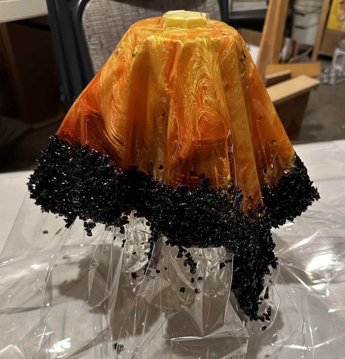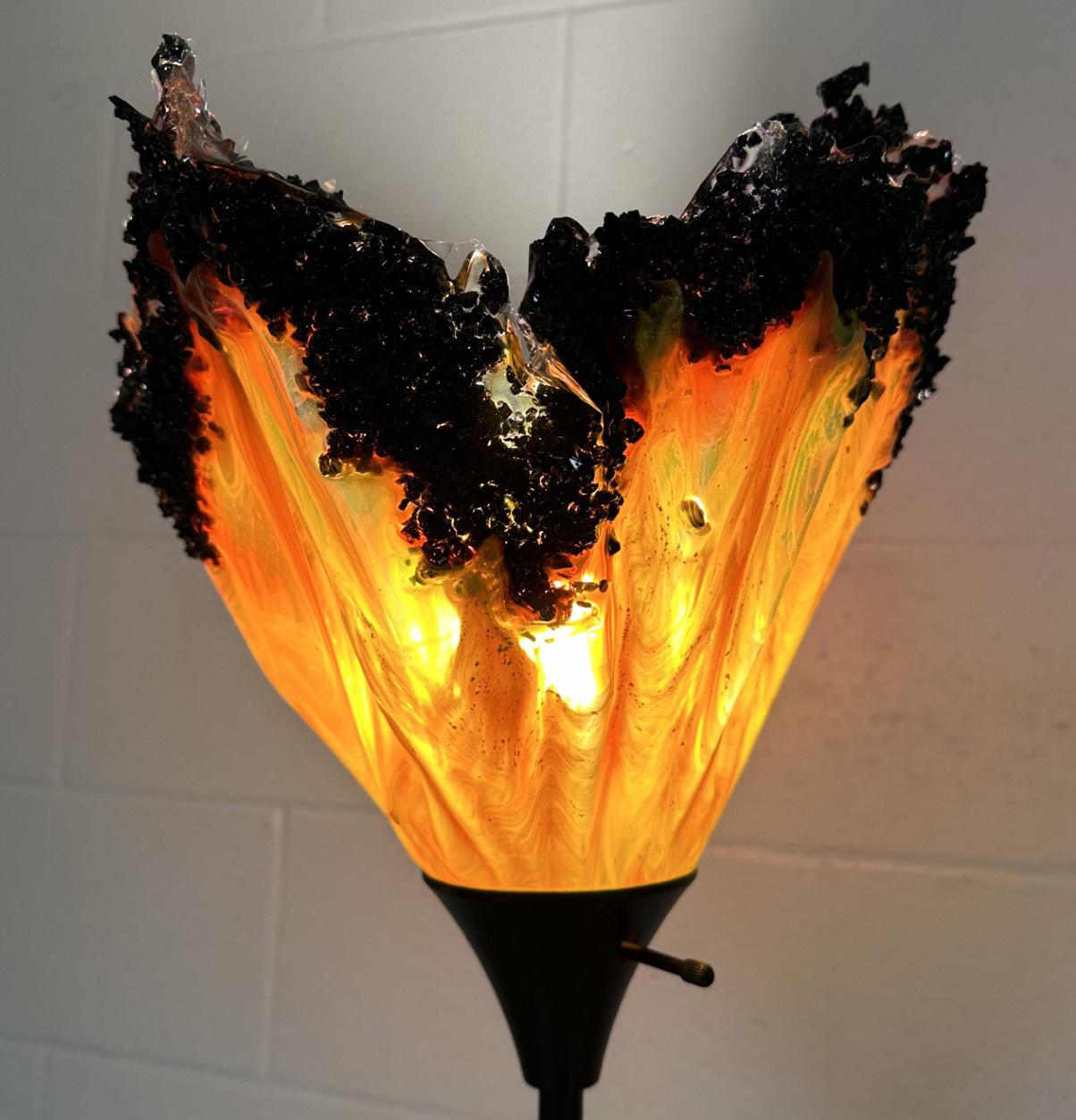 With the semi-translucency of the resin, diffused lighting comes through the colors and folds of the mimicked volcanic explosion while indirect light floods from the top of the fixture.
