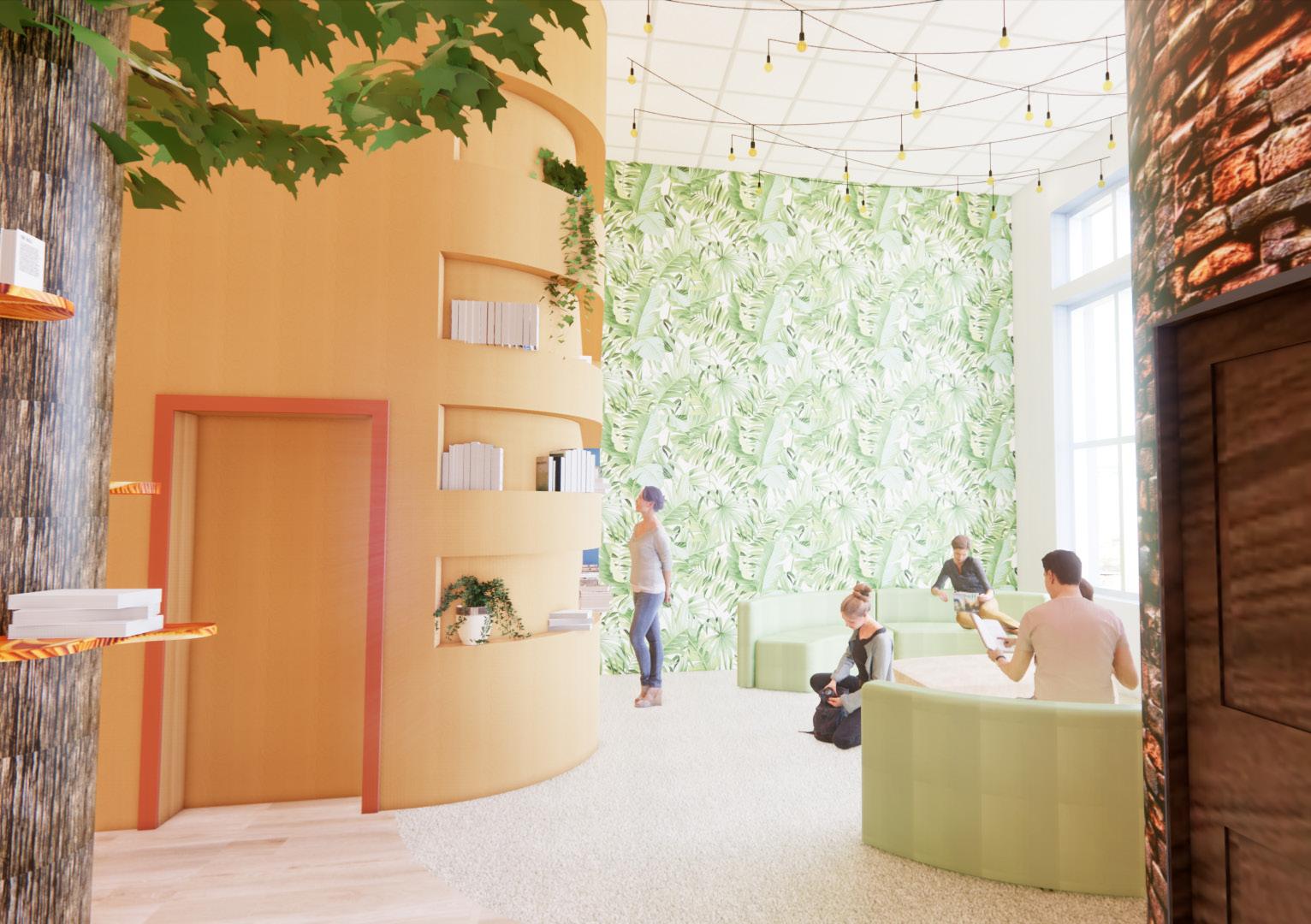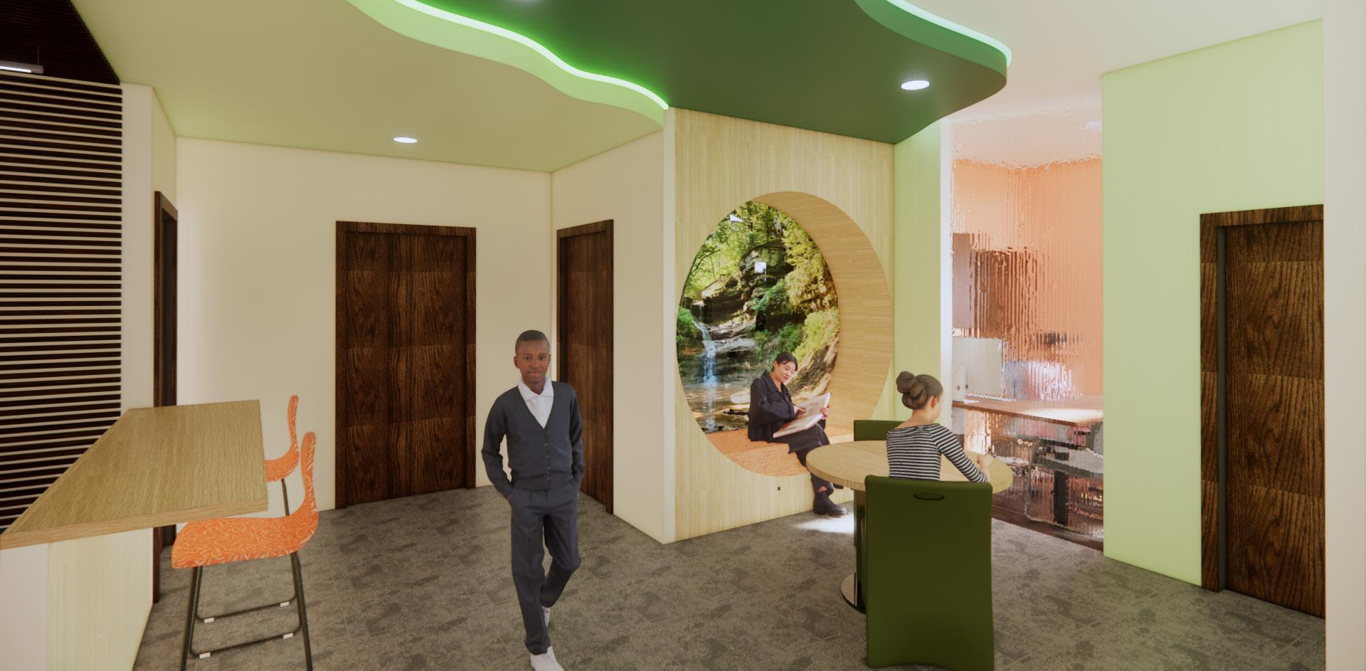 This location will be a homey, comfortable environment for residents to rejuvinate and grow. Aspects relating to the nature of Menomonie cater to the needs of residents and staff alike. Additionaly, the renovation will be spacious and sufficeint for employees to work effectively. The rooms in this space are connected through serene colors and ideas of reflection, which encourage residents and staff to acknowledge their emotions and actions.