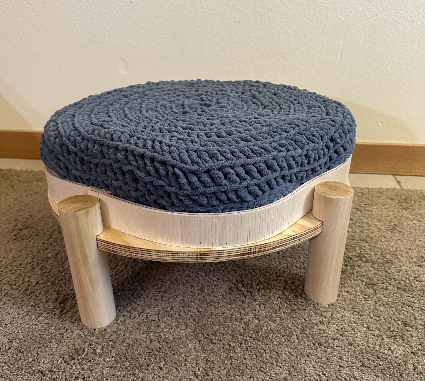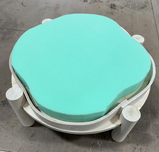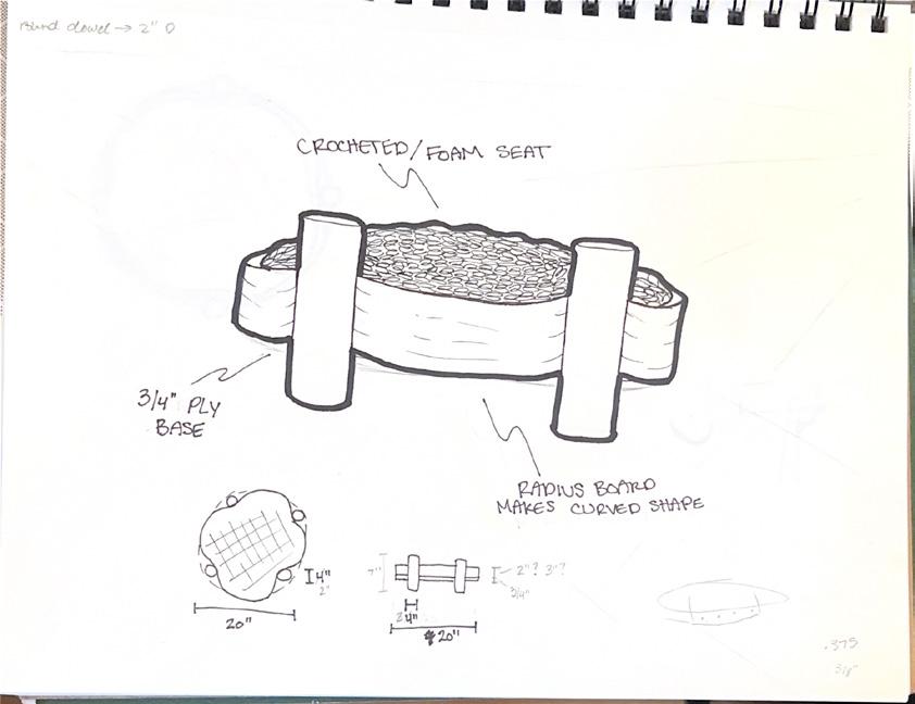 Meraki is a custom seat designed to make large scale crochet projects easier for practicing crafters. A simple base is complimented by sculptural radius board that creates attractive, timeless curvature. To nod toward its purpose, the seat cushion is artistically crocheted for a comfy, cozy, personalized aesthetic.