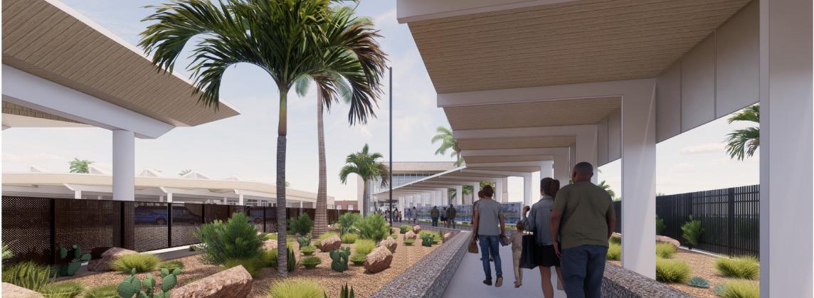 The project includes a 48,400-square-foot main port building, a 7,200-square-foot headhouse, a 3,700-square-foot outbound building, and a 2,900-square-foot canine building. It also features ten inbound and four outbound inspection lanes with hardened booths and canopies, along with secondary inspection areas, enforcement spaces, and staff parking.
