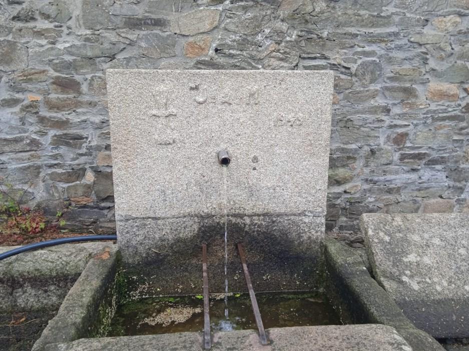A fonte ten esculpido o xugo e as frechas, símbolo da Falanxe. Á dereita, detalle.