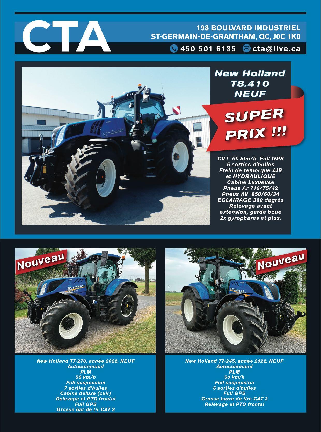 Tracteur New Holland T6.145 CVT, 2016, 1905H. Tracteur NH T4.110, usagé, 2016, 1900H, 3e fct, attache skid, cab, godet tout usage, HP PTO 95, pneus