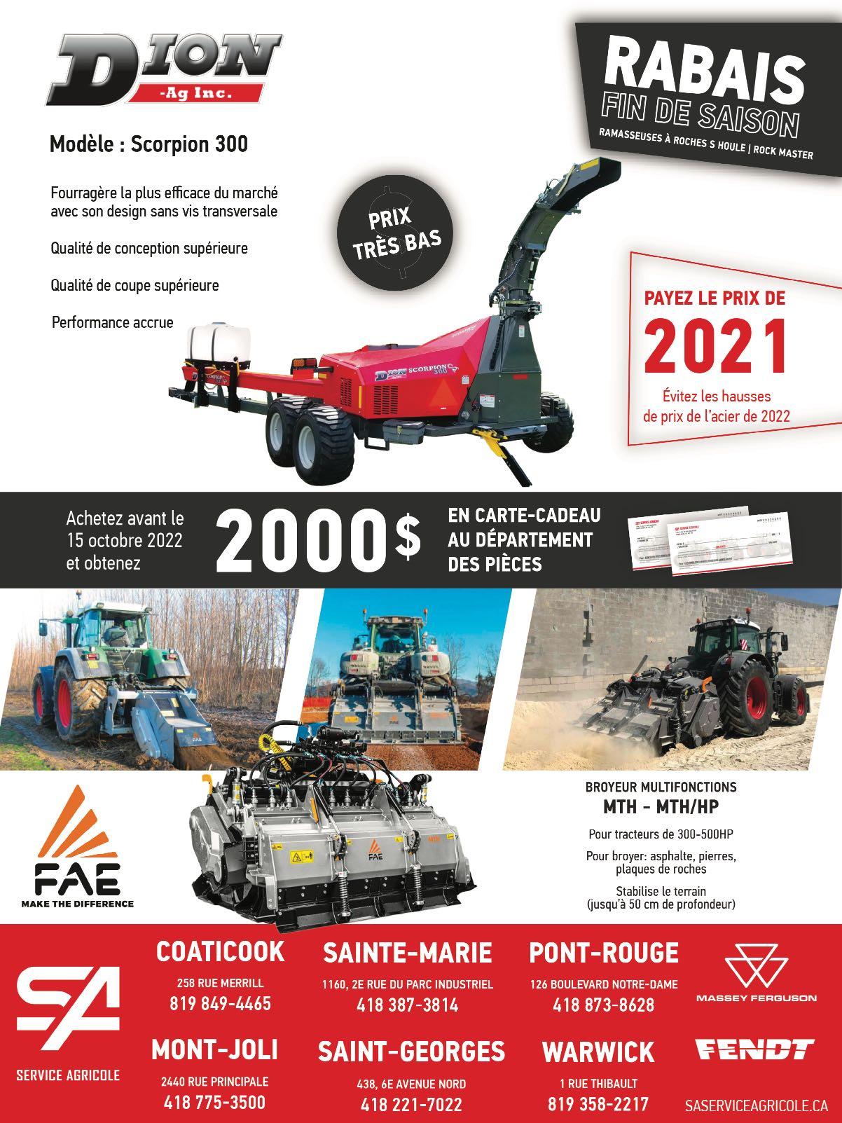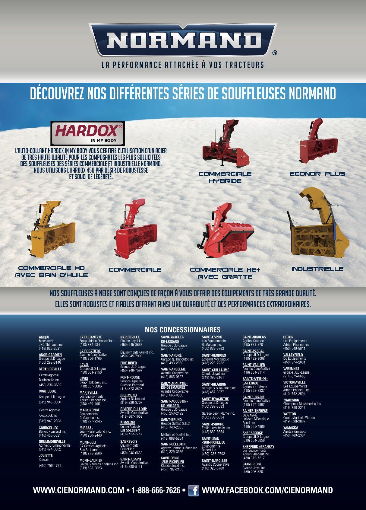 octobre 2022 65 Contacter votre revendeur pour tous les détails!* Sur tous les produits Meyer de plus de 1000$ pour les acheteurs qualifiés0% ouFinancement disponible gros rabais en argent* Achetez maintenant et économisez gros!Achetez maintenant et économisez gros!Achetez maintenant et économisez gros!Achetez maintenant et économisez gros!Achetez maintenant et économisez gros! • Choix de Chargement avant ou arrière • Déchargement avant et arrière • sur remorque, wagon ou camion LYMAN IRVING, REPRÉSENTANT AU QUEBEC (450) 807-6030 Groupe JLD Laguë : Chicoutimi, Coaticook, Laval Mirabel, Sherbrooke, St-Anaclet Ste-Agathe, St-Bruno, St-Pascal Varennes, St-Isidore (On.), Winchester, Carp 1-855-465-2483 Agricoles Ferme-Neuve Inc. Ferme-Neuve 866-587-4393 La Coop des Bois-Francs Victoriaville - Nicolet 819-748-4770 Équipements & pièces JCL. Inc Normandin 418-274-3372 Équipements Inotrac Inc. St-Hyacinthe - Iberville 450-796-3707 Guillet Machinerie Agricole Inc. Pike-River 1-888-863-4444 Machinerie C&H Inc. St-Guillaume 819-396-2185 Machineries Nordtrac Ltee St-Barthélemy 450-885-3202 Unicoop Coopérative Agricole : St-Agapit, St-Anselme, Ste-Marie St-Valier, Québec et St-Narcisse 418-885-9637 Green Tech Winchester, St-Isidore (On.) 1 855 465-2483 Série Crop Max Nouveau kit de pneus de flottaison plus performant Série RT Boss Disponible : déchargement avant ou sur le coté Série SXI Disponible 720 & 865 minots • Épandage plus large améliorer Épandeurs à fumier Meyers de 260 à 1500 minots latéral ou conventionnel, sur remorque ou pour camion Meyer votre spécialiste en boîtes d’ensilage et d’épandeursFa r m E q u i p m ent Série RTX Disponible : déchargement avant ou sur le coté, de 20 à 26 pieds Contactez votre concessionnaire pour une démonstration Remorque Woody V7-12, monocoque 12 tonnes, pneus 550, 16 plis, lumières. Remorque à benne basculante Woody 408, 4'X8', tandem, capacité 4 tonnes, pneus 11L15. Remorque Creekbank ATV30 pour VTT, 4 roues tandem, avec pompe hydraulique électrique 12 volt Faucheuse Enorossi à doigts doubles, 5, 6, 7, 8 et 9 pieds, doigts et couteaux qui bougent Souffleuse a neige Normand N92-280 et N100-310 hybride Nouveau Modèle! Déchiqueteuse Wallenstein, coupe jusqu'a 5'', pour tracteur de 18 à 50 HP, avec alimenteur hyd. Spécial Treuil Wallenstein 11000lbs, 2022, 3 pts, PTO, manette à distance Souffleuse à neige Ber-Vac 96 pouces, 2 vis, très propre. Chargeur à bois Jolex DL1050, avec remorque, capacité 10 000lbs et treuil 7 500 lbs, neuf. SOUFFLEUSES REMORQUES WAGONS NIVELEUSE 5010, Boul. Laurier Est (route 116) St-Hyacinthe (Qué.) J2R 2C2 Choix de souffleuses à neige Econor 72-78-80-84-100, moteur orbite, cylindre sur chute. Grand choix de souffleuses Normand de toute grandeur en inventaire. Faucheuse Faza neuve, 3 couteaux sur chaque disque, sur 3 pts, coupe 8 pieds. (450) 799-3834 (450) 778-7233 leon.plante@hotmail.com Broyeur déportable articulé modèle ZW pour fossé Pulvérisateur KWH 3 points avec réservoir 400L et rampe de 26 pieds Désherbeuse Eco Sprint, 3pts pour désherber en bande. Rotoculteur Inversé, largeur 2.05m ÉQUIPEMENTS LAVALLÉE 312, chemin Principale, St-Joseph-du-Lac, Qc, J0N 1M0 equipementslavallee@qc.aira.com Tél.: 450-473-4144 Fax: 450-473-4053 kwh / O.C.L.L. ORTOLAN Broyeur déporté Perfect 3 points, largeur de 6 pieds!