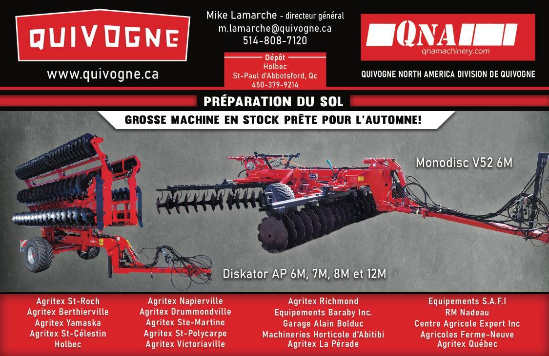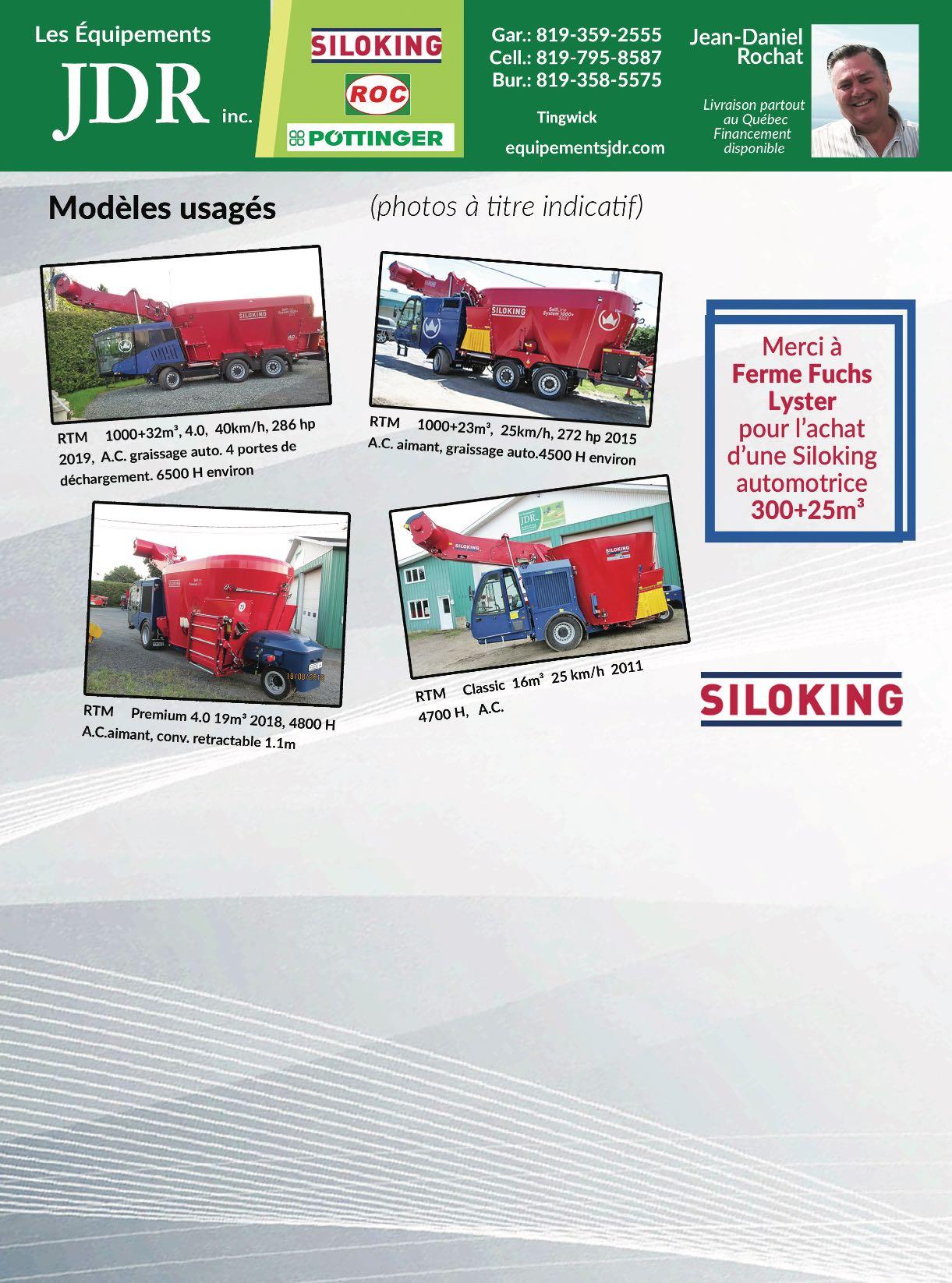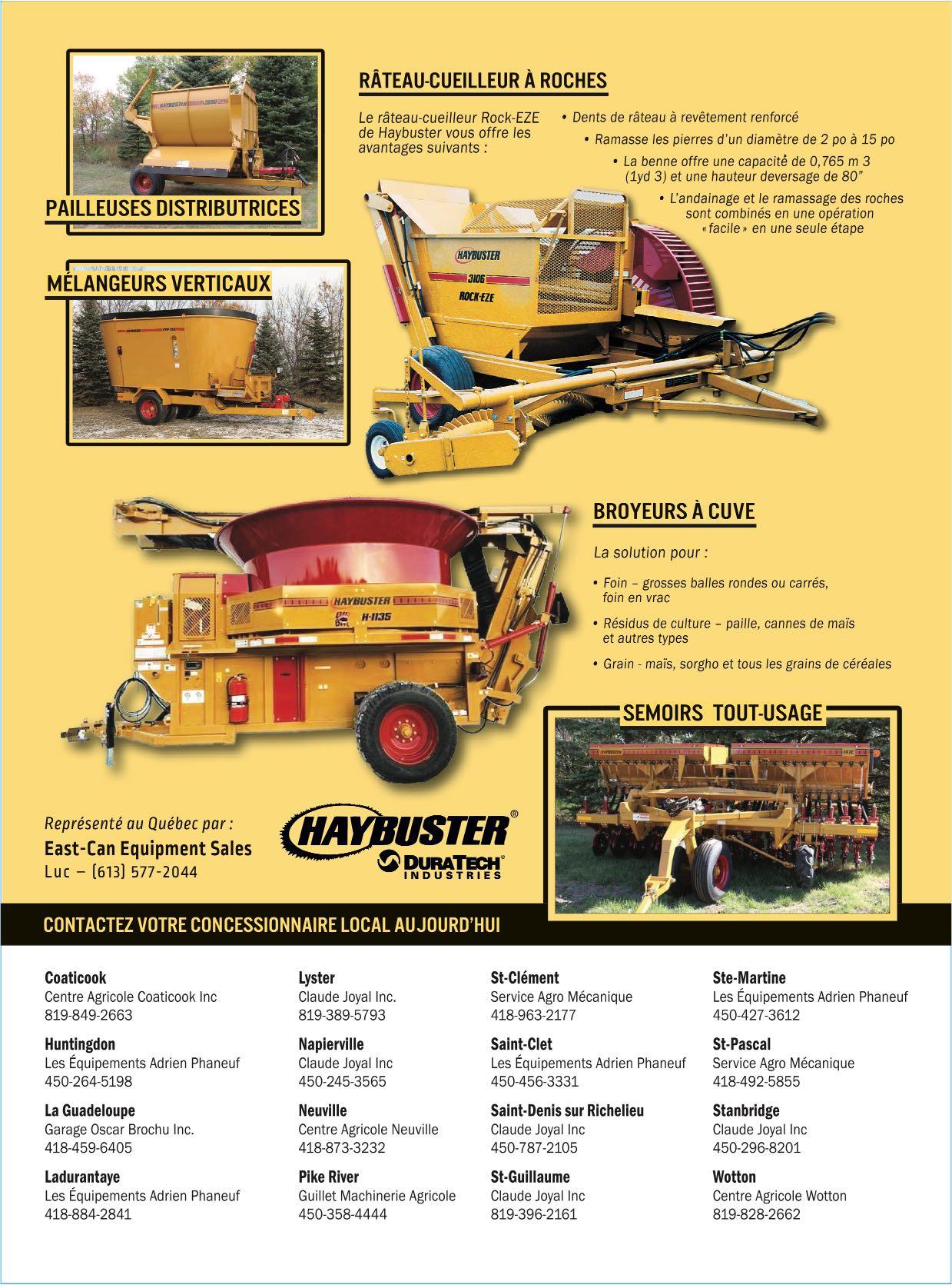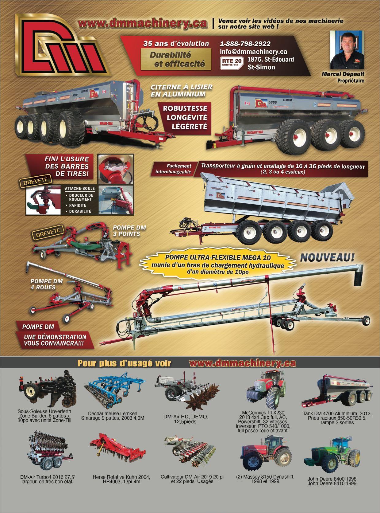 Sylvain Beauregard sylvain.beauregard@live.ca 450.261.7441 Fixe ou repliable de 6,8,12 et 16 rangs 717 rg Du Bas de la Rivière, St-Damase, Qc, J0H 1J0 Pièces nez à maïs Neuf ou usagé Vente service octobre 202214 Choix inégalé de tuyaux pour ponceau Grosseur, longueur et diamètre variés de 1 pouce à 12 pieds Propriétaire : Simon Desmarais (819) 394-2490 143, rang 10, Lefebvre, cté de Drummond, Qc, neufs et usagés Livraison partout au Québec Aussi : acier ondulé - géotextile - drains agricoles et accessoires Réservoirs d’acier ou de fibre de verre de 500 à 10 000 gallons LE CHOIX DE NOTRE ÉQUIPE POUR UN TRAVAIL PROFESSIONNEL # 1 844 387-6660www.FOURCHECYR.com 191, Commerciale, Saint-Odilon (Québec) G0S 3A0 VIDÉOS PHOTOS FOURCHES COMMERCIALES ET INDUSTRIELLES OPTIMISEZ VOTRE VISIBILITÉ en affichant votre carte d'affaires dans nos revues!