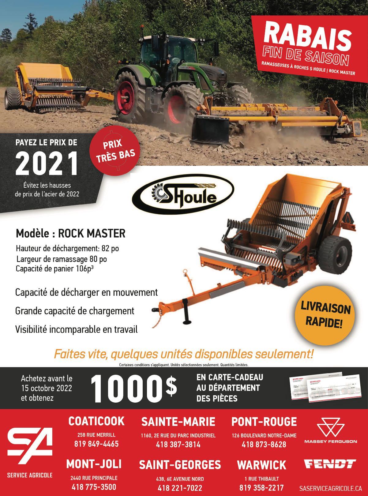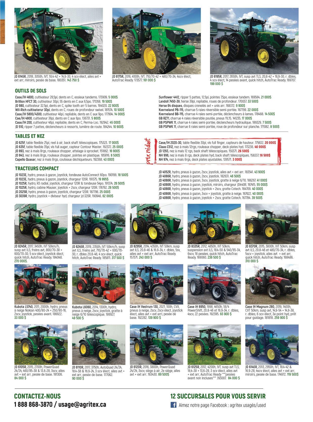 *Prix payez et emportez. Des erreurs peuvent se glisser lors de l’impression. Les informations du concessionnaire ont donc préséance sur celles-ci. Table à soya Case 1020, 20 pieds. Aussi 15-25 et 30 pieds. Table a grain Case IH 1010, coupe direct, 20 pieds, très propre. Semoir Case IH 5100, 21 disques, avec roues tasseuses. Choix de 3 Chisel Hiniker 7500 Sarcleur Case IH 183, 12 rangs, dents en S, repliage hydraulique Cultivateur CIH 4800, 25pi, avec peignes arrière Gratte niveleuse American 12 pieds, neuve. Aussi 6-8 et 10 pieds. Herse White 271 et 273, choix de 18 à 30’ Autres marques disponible Rouleau W.P. Farmhand 28 pieds, rouleaux en fer. Choix de 3 tables à soya MF 9650, de 16 a 20’ pour MF 8450 et 8460. Aussi 1859 et 9120, 15 à 20’ Choix de nettoyeur à grain 2 phases: Hy-Cap, Neco, Koyker. Sarcleur Case IH, 12 rangs, repliable hyd., dents en C Nez à maïs Case IH 3412, 12 rgs, hydr deck plate, couteaux chopper. Aussi: 3408 hydr deck plate, chopper. Choix de tables à soya Case IH 1020 et 820 de 15 à 30 pi. Aussi choix de 810 et 1010 à grain de 15 à 20’. Choix de Semoirs Case IH 5400, 20 pieds avec ou sans CPH Yetter. Sarcleur Case IH 183, choix de 6, 8 12 ou 16 rangs. Boîte à grains EZ flow avec vis. Plusieurs autres marques et modèles en inventaire Venez les essayer! SPÉCIAL 95000$ Mahindra 8100, 100HP, 4RM avec cabine et chargeur. Case IH 330, Vertical Tillage, 34 pieds, comme neuf Mahindra 9110, 4 RM, cabine et chargeur. 116000$ octobre 2022 83