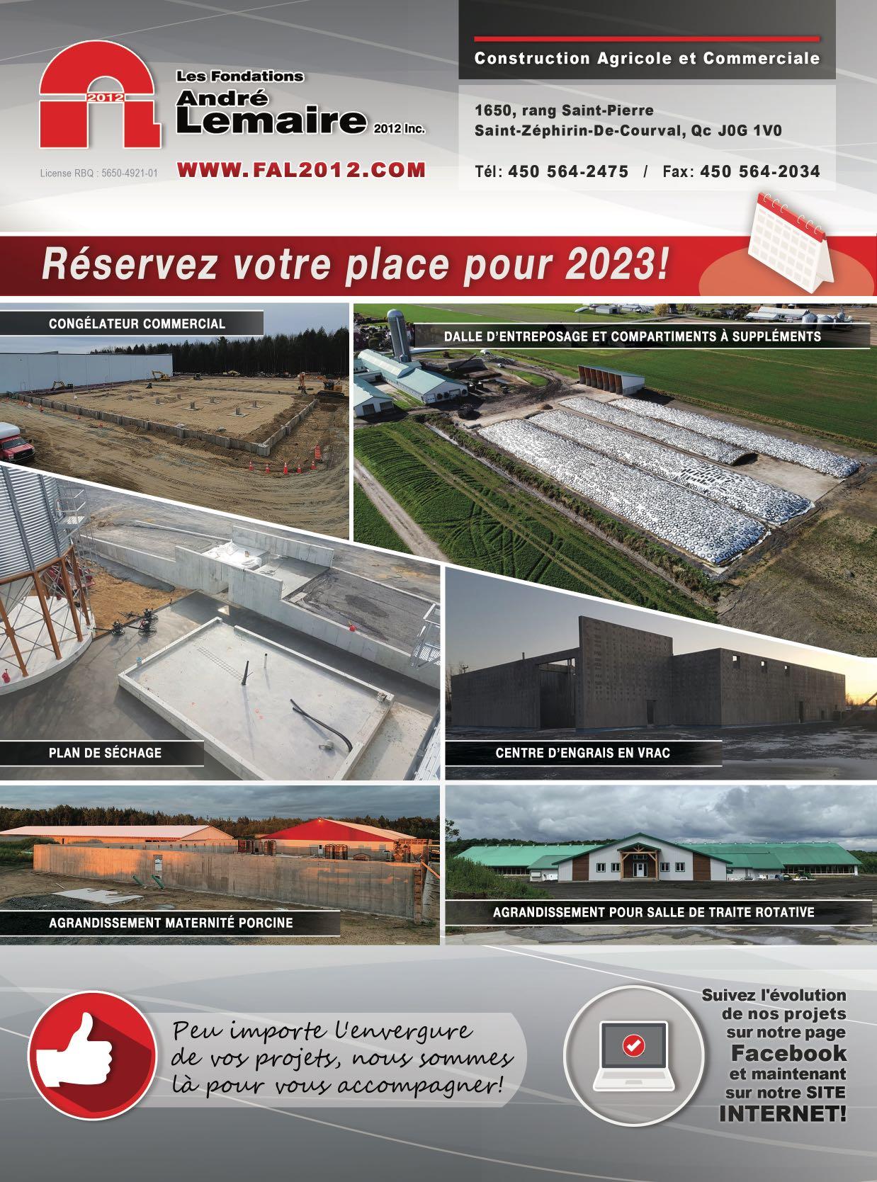 • Ingénierie • Construction • Agronomie www.cossette.qc.ca 3020, rue des Prairies Trois-Rivières, Qué. G8V 1W5 www.thorco.ca 1 800 852-7971 • Entrepreneur général en construction • Conception de bâtiments d’élevage en tout genre • Structure d’entreposage • PAEF • Recyclage et épandage de MRF • Système de traitement d’eaux usées Un projet de construction en vue ? Plusieurs spécialités sous le même toit ! Ne tardez pas et contactez-nous maintenant ! MAREVUEAGRICOLE.COM octobre 202262
