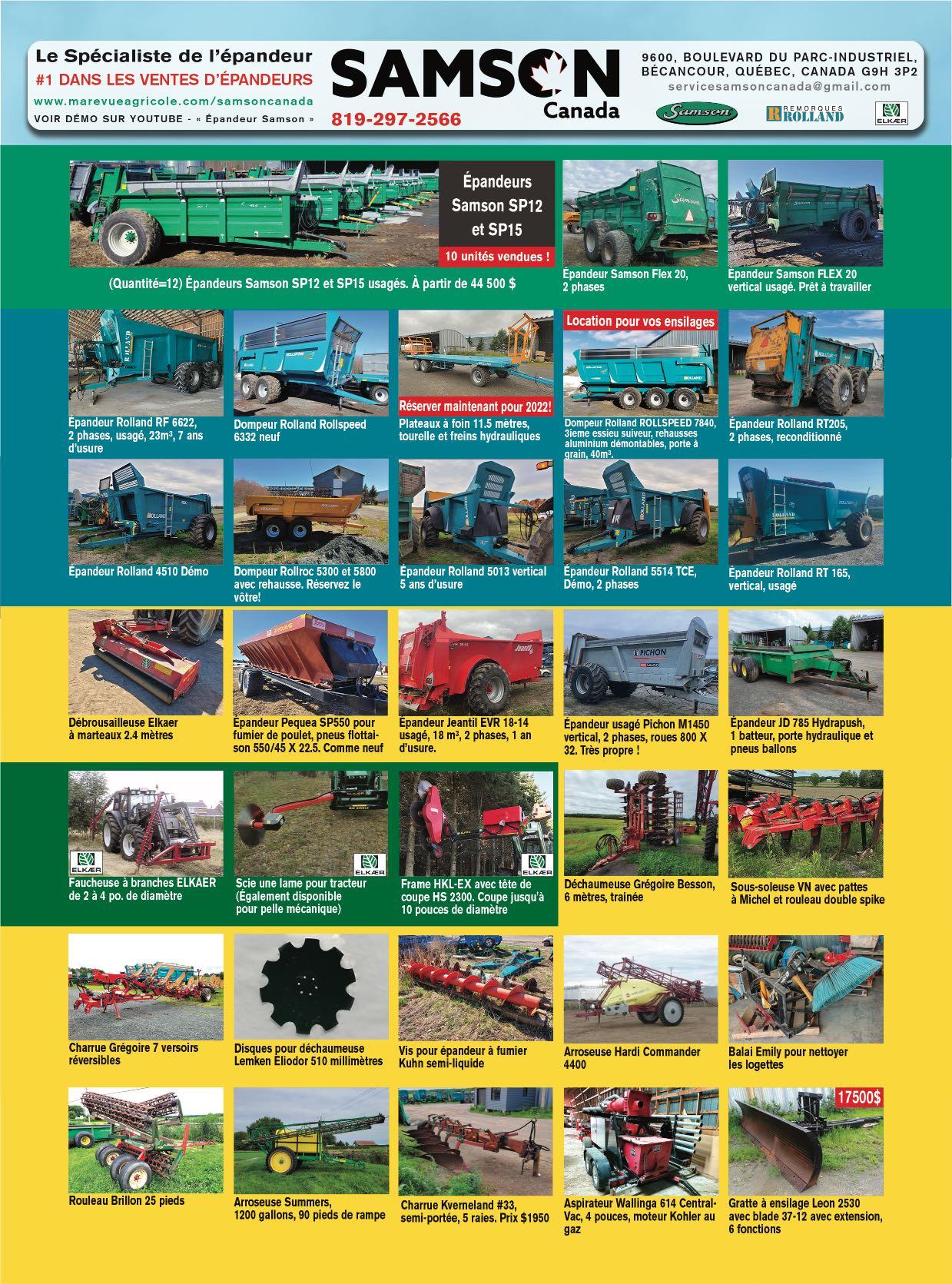 9600, BOULEVARD DU PARC-INDUSTRIEL, BÉCANCOUR, QUÉBEC, CANADA G9H 3P2 servicesamsoncanada@gmail.com 819-297-2566 Plusieurs types de machineries disponibles en location! Réservez maintenant ! Location de plateaux à foin Rolland Location de dompeurs Rollroc pour les gros travaux! Location d’épandeurs 2 phases et vertical Location de dompeurs de différentes capacités pour Ensilage/Grain/fumier Mike Mathis a été décerné meilleur vendeur au monde d’épandeurs Rolland Rollforce en 2020 ! Plusieurs locations disponibles pour vos travaux. Réservez maintenant ! Plusieurs locations disponibles pour vos travaux. Réservez maintenant ! Plusieurs locations disponibles pour vos travaux. Réservez maintenant ! Livraison partout au Québec! Livraison partout au Québec! Le Spécialiste de l’épandeur #1 DANS LES VENTES D’ÉPANDEURS www.marevueagricole.com/samsoncanada VOIR DÉMO SUR YOUTUBE - « Épandeur Samson » 78