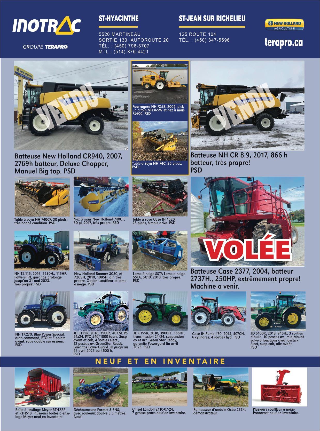 vente@raymondlasalle.com fax 450-755-2128 1561, Rte 158 St-Thomas de Joliette (Qc)450-756-2121 Tracteur New Holland T6.155, 2017, 1600H., très propre, 16X16, chargeur Alö, pneu Alliance, neuf, 108 000 $ Tracteur NH 9680, 1995, 8500H., très propre, entretien fait au complet, prêt à partir, financement disponible. 86 500 $ Tracteur NH 7740, 1997, 8300H., très propre, powershift, prête à partir, 28 000 $ Pépine NH B95C, 2015, 2500H., très propre, transm 4 vitesses, boom télescopique, 68 000 $ Batteuse NH CX8080, 2015, 1139.21H., 299 000 $ Tracteur NH TS115A, 2004, 7800H., très bonne mécanique, chargeur Alö, transm 16X16, 49 500 $ Chargeur sur chenilles NH C227, 2018, 1600H., très propre, joystick control high flow, a/c, 62 000 $ Tracteur John Deere 7260R, 2012, 5500H., roues doubles arr inclus, très propre, IVT, green star ready, 148 000 $ Tracteur JD 8300, 1996, 12000H., bonne mécanique, roues doubles inclus, pas de paiement ni intérêt 1 an, 62 000 $ Tracteur Kubota M108X, 2008, 5300H., chargeur Alö, transm pwrshift, financement disponible 46 000 $ Batteuse NH CR9060, 2008, 2222H., roues doubles neuve, chopper arr, remise à neuf et garantie 215 000 $ Tracteur Case IH PUMA 150, 2015, 95 000 $ Tracteur AGCO GT65, 2005, 3500H., très propre, chargeur, cab, financement et livraison disponible, 35 000$ Arroseuse Hardi 2400, très propre, 650 gal, 68 pi de rampes, 16500$ Semoir Lemken SOLITAIRE 9, très propre, prête à partir, 98 000$ Tracteur Kubota M6.101, 2018, 1250H., comme neuf, chargeur inclus, prêt à partir, pas de paiement ni intérêt, pendant 1 an, 84 000 $ Semoir Case Inter 5100, très propre, prêt à partir , 7500$ Déchaumeuse Amazone 4003, 2021, 5H., démo de 4 mètres, prix 2021 sans augmentation! Sous garantie Herse Sunflower 434-23, 23 pieds, très propre, 35 000$ Wagon Horst, plateforme 20 pieds. 13 500 $ Déchaumeuse Landoll 7822-20, 2021, démo, 20 pieds de large, conçu très robuste, idéal pour le printemps et l'automne. Herse à disques Kongskilde 9225, démo, 25 pi de large, disc de 20 po. Chisel Case IH 530B, Ecolo, très propre, prête à partir, financement et livraison disponible, 29 900$ Conditionneur à foin AgLand 6610, très propre, prêt à partir. 19 500 $ Nez de batteuse JD, 2002, 8 rgs, 21 500 $ Épandeur Amazone ZA-V 3000, Neuf. Sous-soleuse DMI 5 pattes, très propre, 8 500 $ Tracteur New Holland T6.145, 2018, 2200H., très propre, transmission DCT, chargeur Stoll, 120 000 $ Tracteur New Holland T6-145, 1100H., Financement disponible. 97 000 $ Tracteur NH T6.145, 2017, 2920H., 115HP, très propre, financement pas d'intérêt pas de paiement 1 an, 86 500 $ octobre 2022 59