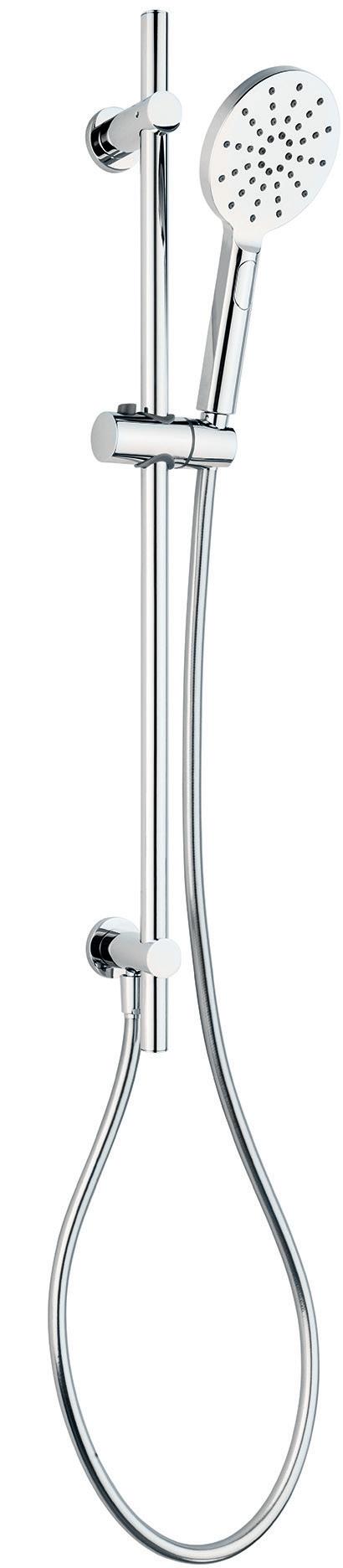 ROUND SHOWER SLIDER RAIL KIT with fixed round slider rail, 3 mode round handshower on adjustable slider bracket with shower hose 1.5m and soap dish. Suitable for use with Exposed Shower Valves or can be adapted for use with Concealed Shower Valves by using the NOW Collection Wall Elbow NWERO