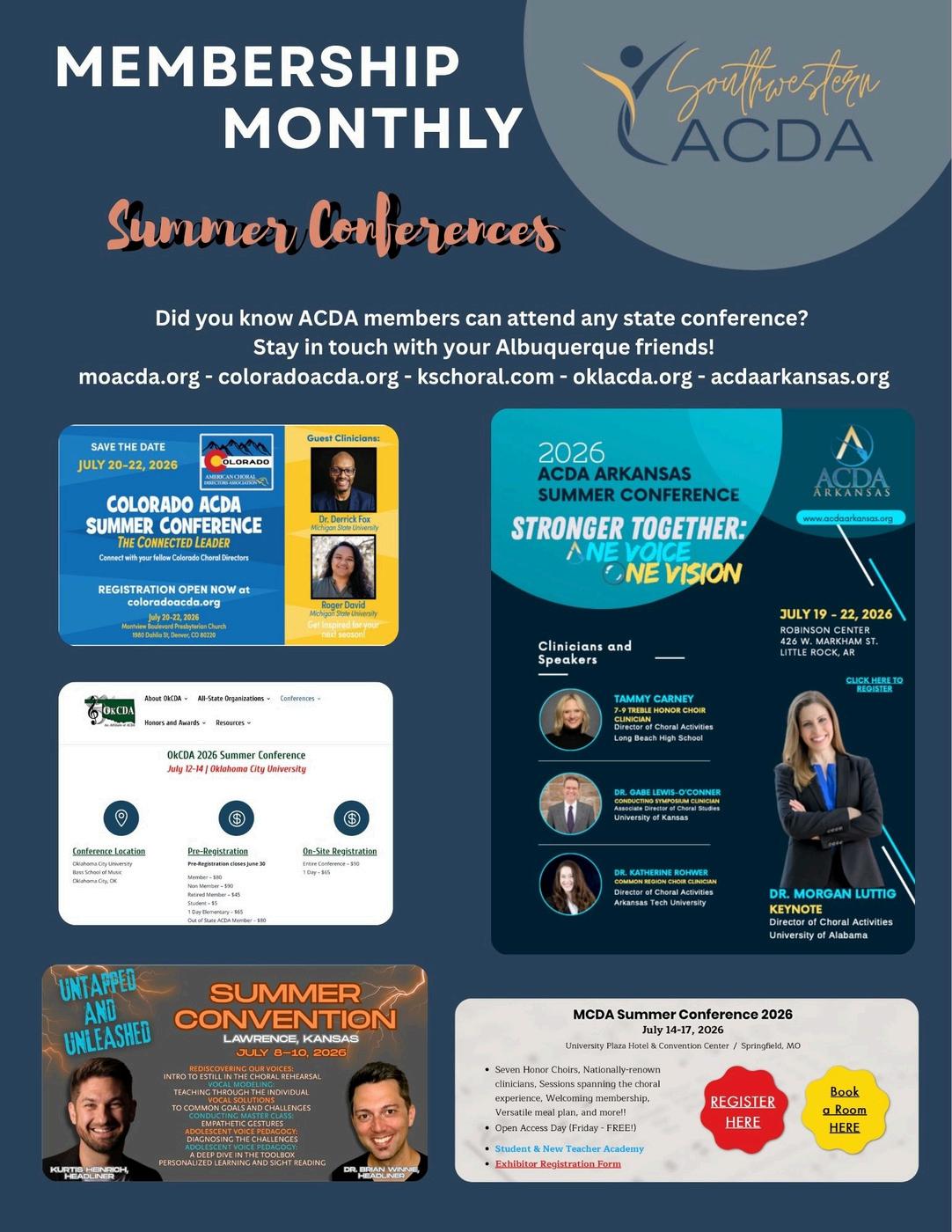 Over the past forty years, I have had the privilege to serve the association in many capacities, including President,programandsitechair,sessionpresenter,presider,andTreasurer.Ihaveconductedhonorchoirs, hadmychoirsperformatSWACDAConferences,andevendrivenashuttlebustoandfromconcertvenues. Every experience fueled my desire to contribute more, leaving me eager for the next opportunity. These roleshavehelpedmegrowasaneducator,enhancedmyorganizationalabilities,providedopportunitiesto observe and learn from other directors, and allowed me to build a network with exceptional conductors bothwithinSWACDAandbeyond.Myunderstandingofchoralliteraturehasbroadened,andIhaveforged lifelong friendships and professional connections. Serving required time and effort beyond my personal and professional obligations, but I gained far more than I gave. I am deeply grateful for the enrichment volunteeringhasbroughttomylifeasIsupportedSWACDAanditsmembers.