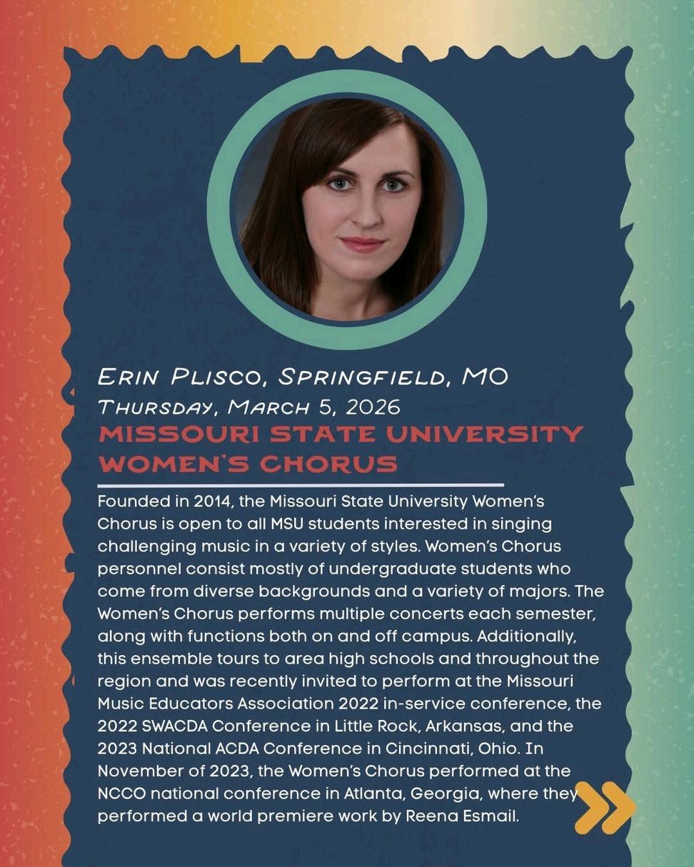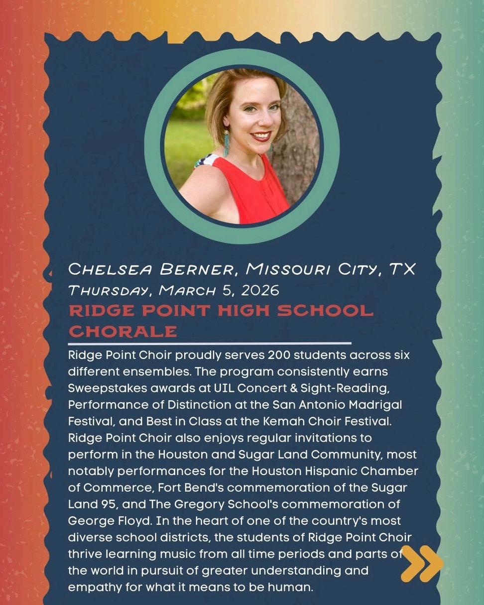 By the time you receive this issue, we’ll be about halfway through the open window for submitting singers for the honor choirs in Albuquerque. If you ’ ve already taken the time to submit, thank you, and good luck to your students as they prepare for this exciting opportunity! If you haven’t yet, I’d encourage you to consider giving your singers the chance to be part of something truly special The honor choir experience is transformative for students, musically, personally, and socially And this year, our lineup of conductors is second to none Each one brings unique artistry, energy, and vision to the podium, and I am absolutely thrilled that every single conductor said “YES!” when asked to be part of our conference