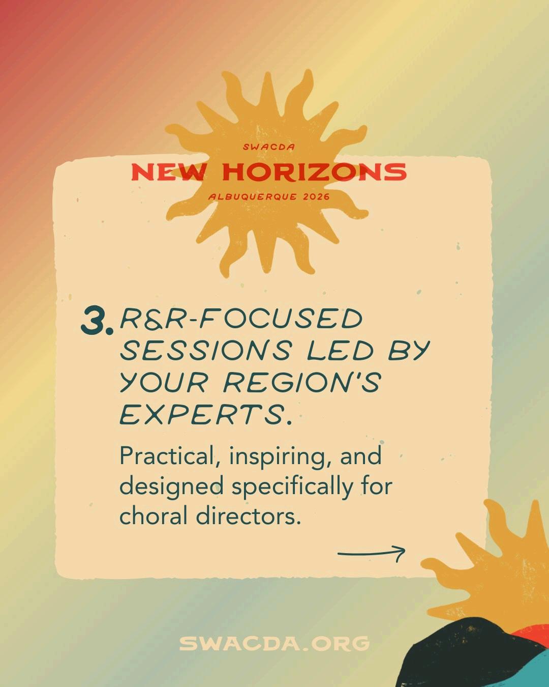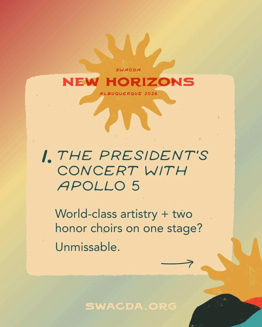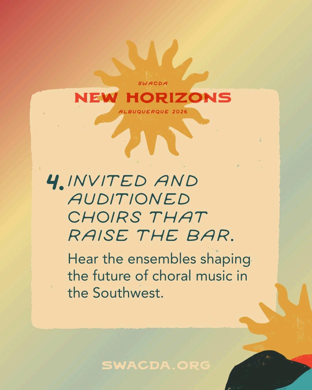 Evenmoreexciting,theSouthwestAmericanChoralDirectorsAssociation(SWACDA)Conferencewillbe held right here in Albuquerque for the very first time! This is a momentous opportunity to welcome colleagues from across our region to experience the warmth, artistry, and hospitality that make New Mexicosospecial.Fromoutstandingconcertstoinspiringsessions,it’ssuretobeamemorablecelebration ofchoralexcellence.