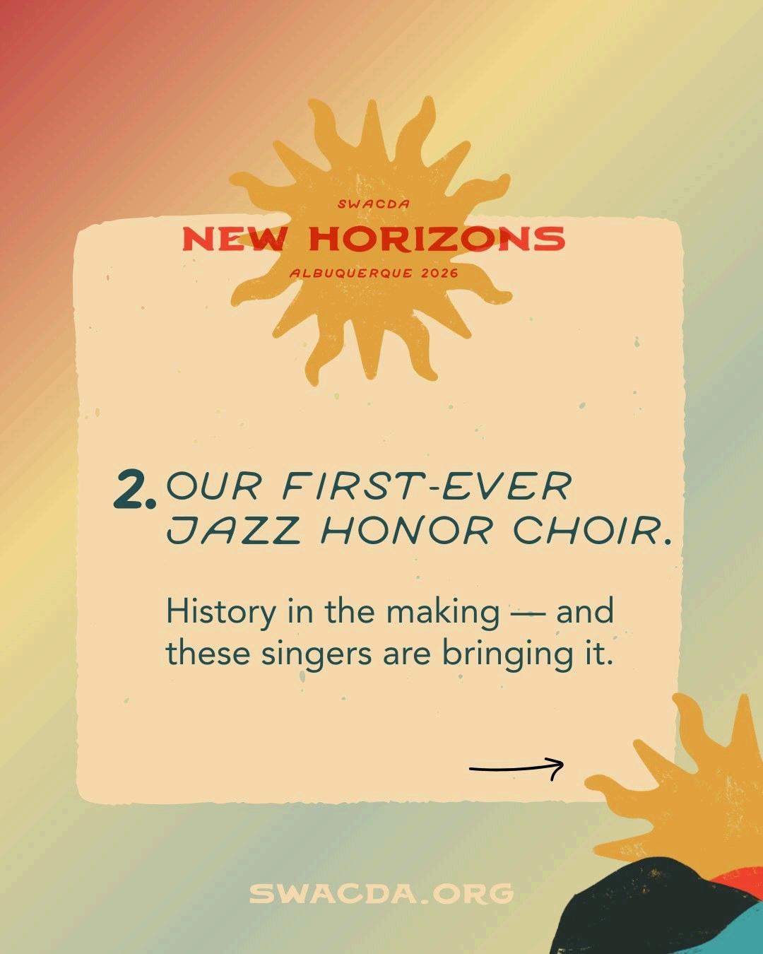 I encourage everyone in our state to participate, connect, and take pride in all that New Mexico’s choral community has to offer.Whether you ’ re preparing singers for All-State or planning to attend SWACDA, yourcommitmentkeepsourartformthrivingandourcommunitystrong IlookforwardtoseeingmanyofyouinAlbuquerquethisspring.Let’smakeitaneventtoremember!
