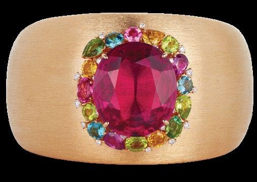 Cuff featuring rubellite (32.97ct), diamonds, yellow sapphires, green tourmalines, peridots, rhodolites and blue topazes. Crafted in 18-karat brushed yellow gold.