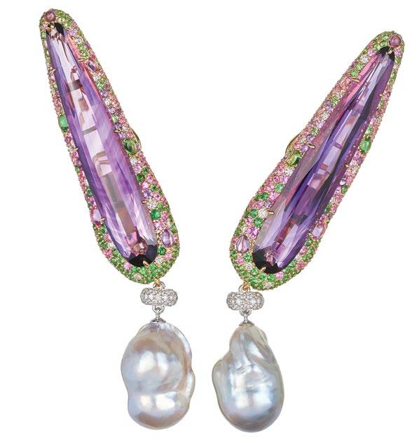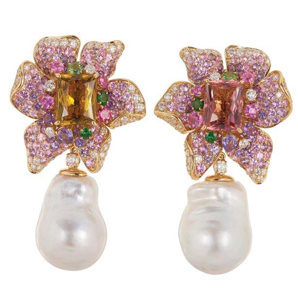 Earrings featuring green tourmaline (6.23ct), pink tourmaline (6.57ct), Australian South Sea pearls, diamonds, pink sapphires, purple sapphires, amethysts, rose de France, pink tourmalines and tsavorites.