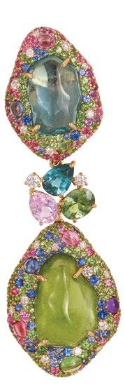 Earrings featuring large baroque gems of aquamarine, green tourmaline and peridot, set with diamonds, blue sapphires, pink sapphires, tsavorites, amethysts, rare blue zircons, kunzites, pink tourmalines and demantoids.