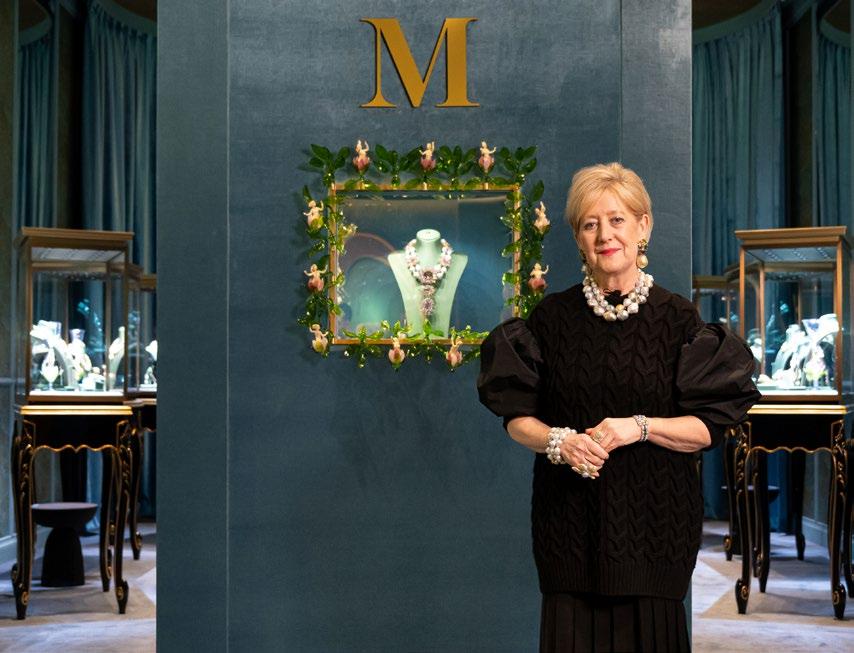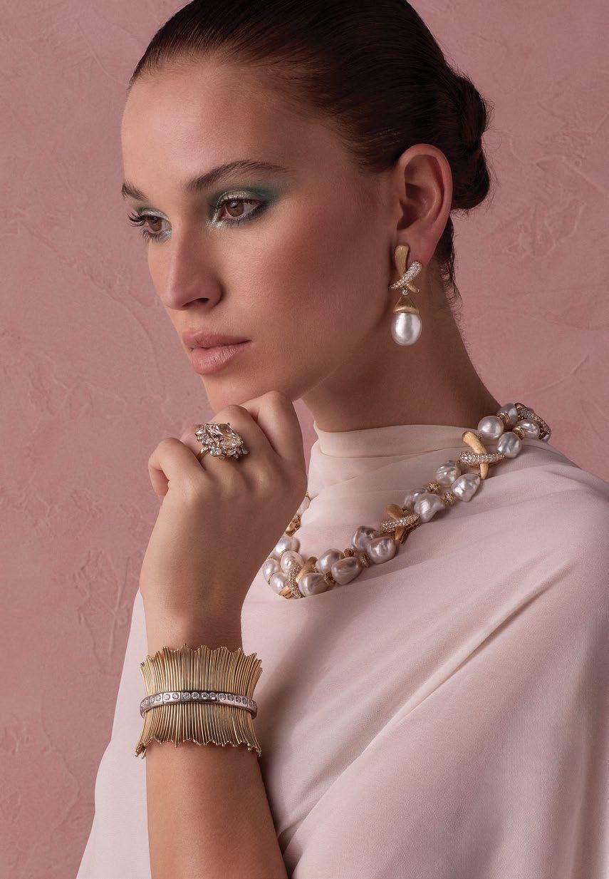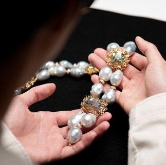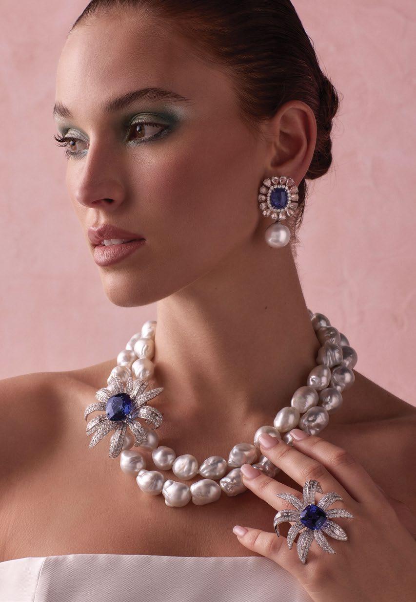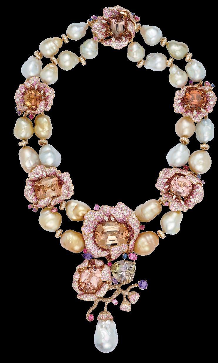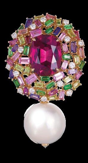 Collier featuring eight significant tourmalines (total 240.56ct) including a gem of 65.85ct at the center of the piece, along with an impressive collection of twenty-seven large Australian South Sea baroque pearls. The twenty-six pearls in the collier’s double strands measure 15-20mm, while a single, particularly rare example measuring 21 x 32mm is placed as the focal point beneath the hero tourmalines. Bloem is completed with white diamonds, brown diamonds, blue, pink and purple sapphires, pink tourmalines, amethysts and rubellites.
