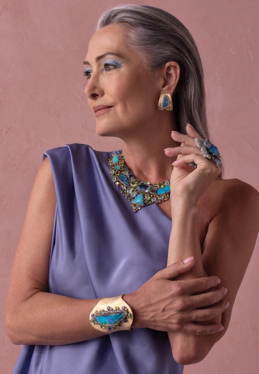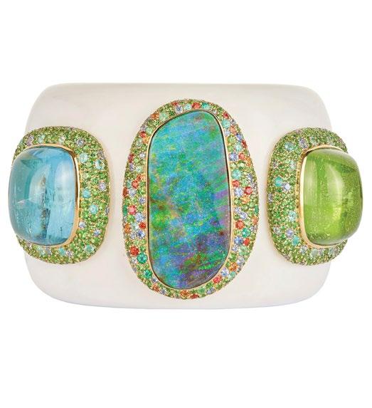 Cuff featuring Australian boulder opal (54.25ct), aquamarine (64.35ct), peridot (78.28ct), white opal, blue sapphires, orange sapphires, Paraiba tourmalines and tsavorites. Crafted in 18-karat yellow and white gold.