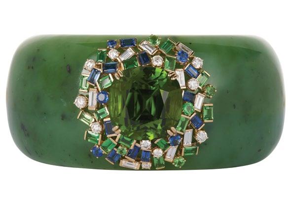 Cuff featuring green tourmaline (40.82ct), nephrite (1,096.65ct), diamonds, tsavorites and blue sapphires. Crafted in 18-karat yellow gold.