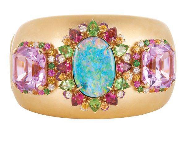 Cuff featuring Australian boulder opal (21.10ct), kunzites (53.75ct), diamonds, yellow sapphires, pink sapphires, tsavorites, amethysts and pink tourmalines.