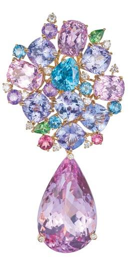 Earrings featuring kunzites (101.94ct), diamonds, tsavorites, blue topazes, pink tourmalines, amethysts, tanzanites, blue zircons and kunzites. Crafted in 18-karat yellow and white gold.