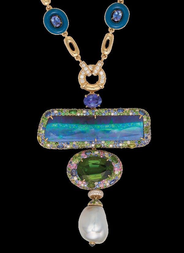 Necklace featuring Australian black boulder opal (87.41ct), peridot (38.40ct), Australian South Sea baroque pearl, diamonds, blue sapphires, pink sapphires, tsavorites, peridots, tanzanites and blue enamel. Crafted in 18-karat yellow gold.