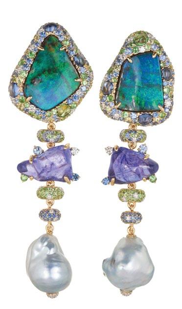 Earrings featuring Australian boulder opals (30.85ct), tanzanites (23.32ct), Australian South Sea baroque pearls, diamonds, blue sapphires, tsavorites and peridots.