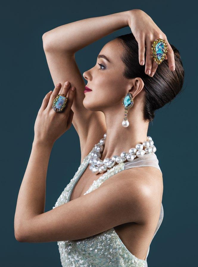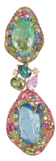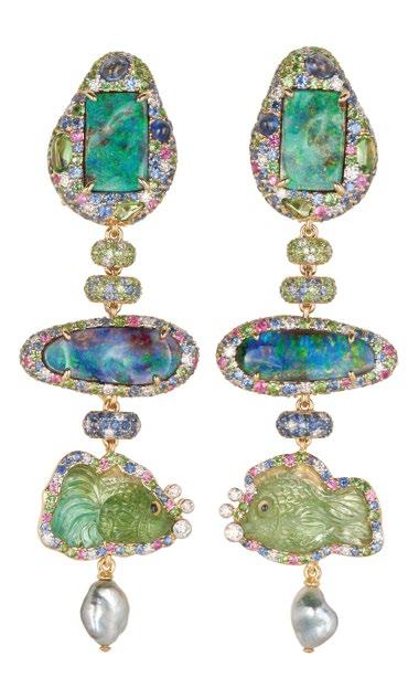 Earrings featuring Australian boulder opals (22.13ct), green tourmalines (18.33ct), Tahitian pearls, diamonds, blue sapphires, pink sapphires and tsavorites.