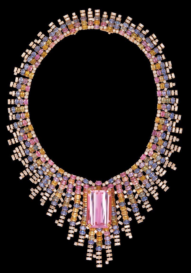 Collier featuring extra-large baroque gems of aquamarine, tanzanite, rubellite, amethyst and peridot, set with a suite of diamonds, rare blue zircons, kunzites, blue sapphires, pink sapphires, rose de France, demantoids, green tourmalines, amethysts and tsavorites. Crafted in 18-karat white and yellow gold.