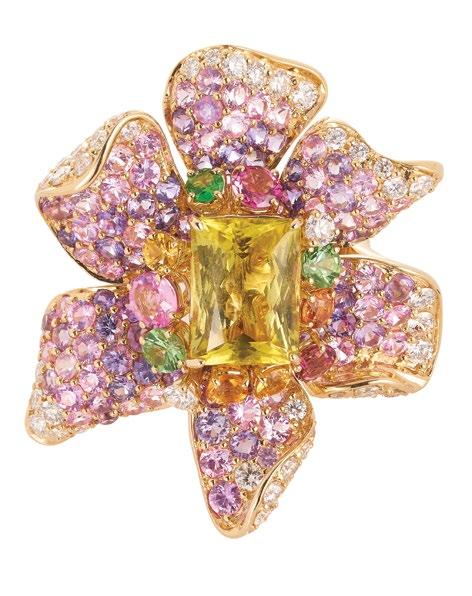 Ring featuring tourmaline (4.81ct), diamonds, yellow sapphires, pink sapphires, purple sapphires, tsavorites, amethysts, rose de France and pink tourmalines. Crafted in 18-karat yellow gold.