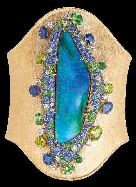 Cuff featuring Australian boulder opal (50.36ct), diamonds, blue sapphires, tsavorites and peridots.