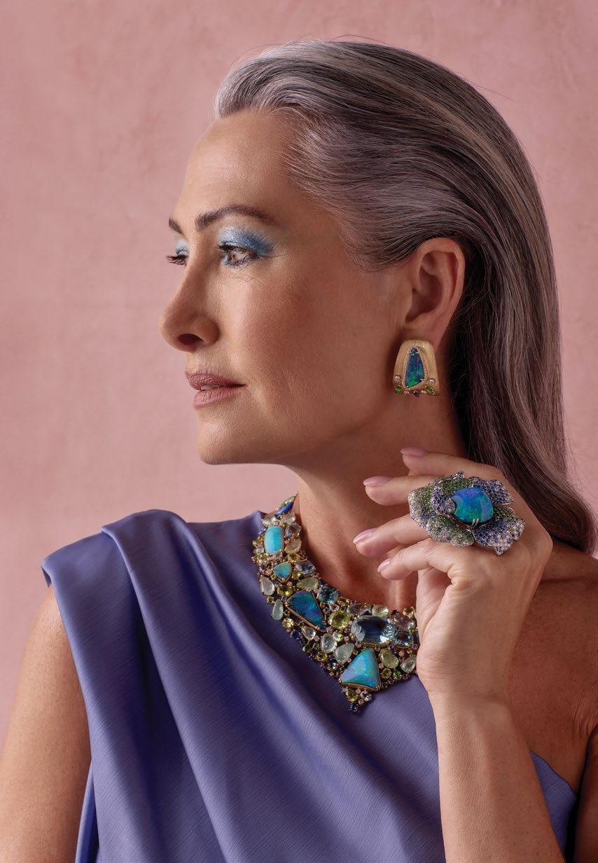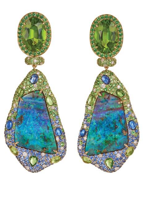 Earrings featuring peridots (24.01ct), Australian boulder opals (62.66ct), tsavorites, diamonds and blue sapphires.