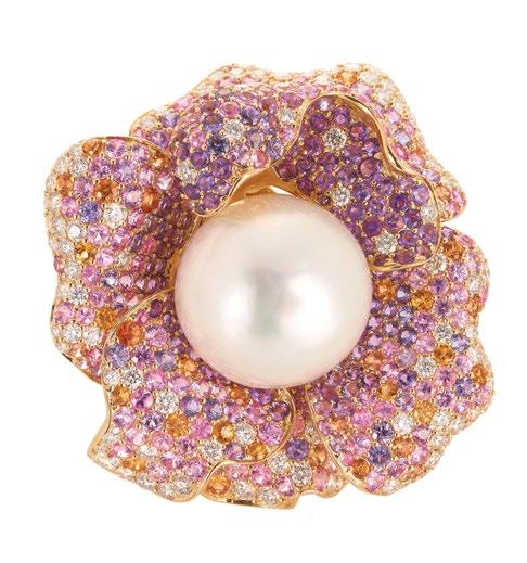 Ring featuring Australian South Sea pearl, diamonds, pink sapphires, orange sapphires and purple sapphires.