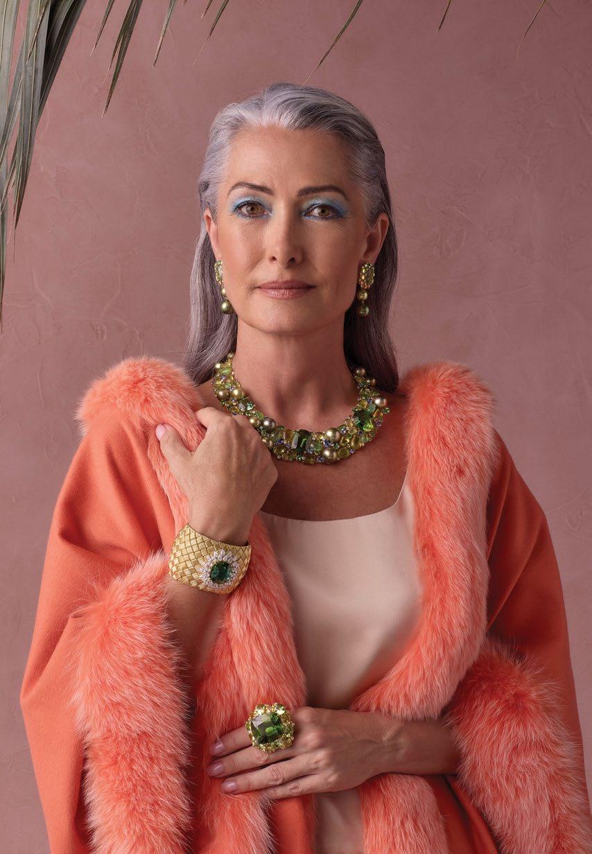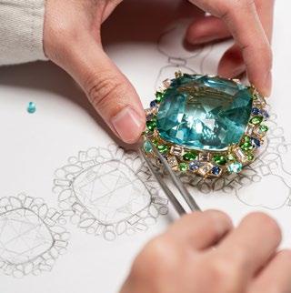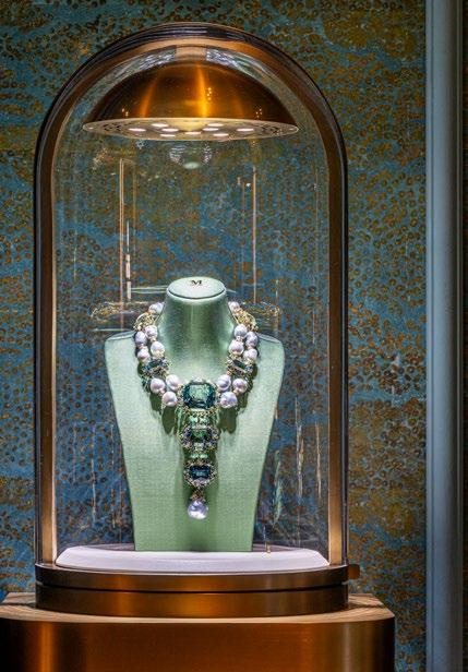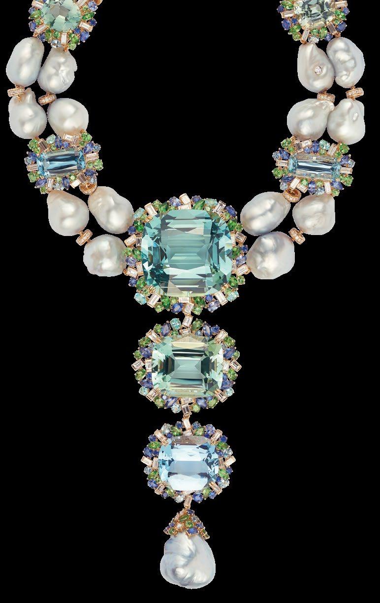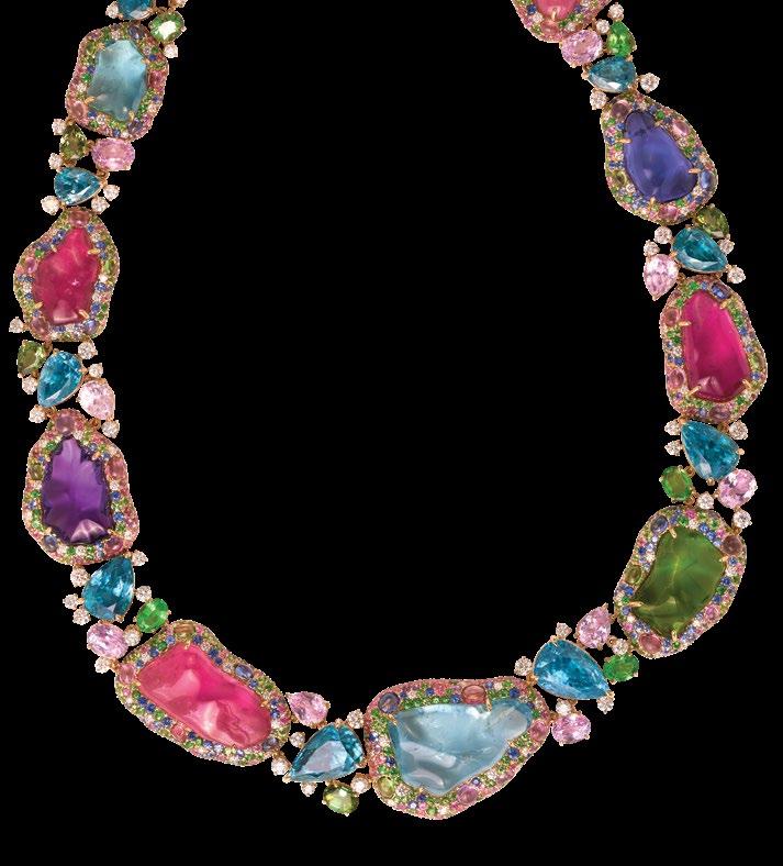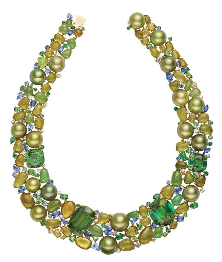 Collier featuring green tourmalines (63.42ct), peridots, Paraiba tourmalines, pistachio pearls, diamonds, blue sapphires and tsavorites. Crafted in 18-karat yellow gold.