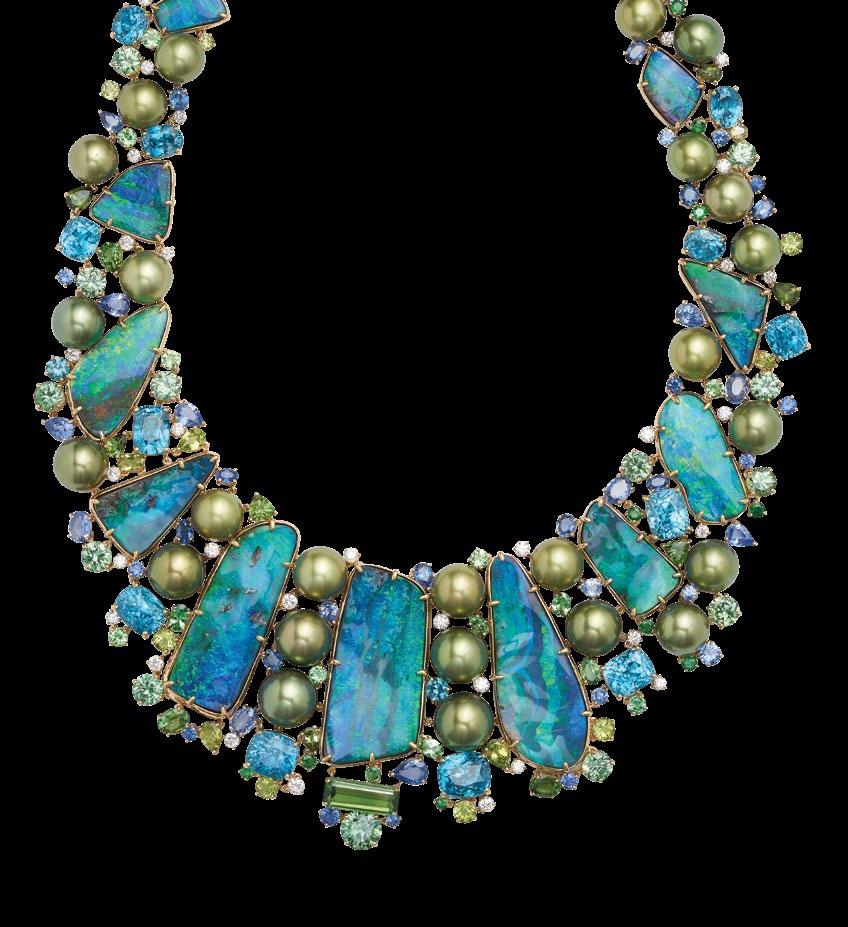 Collier featuring Australian boulder opals (253.16ct), pistachio pearls, green and blue tourmalines, diamonds, blue sapphires, tsavorites, peridots, zircons and demantoids. Crafted in 18-karat yellow gold.