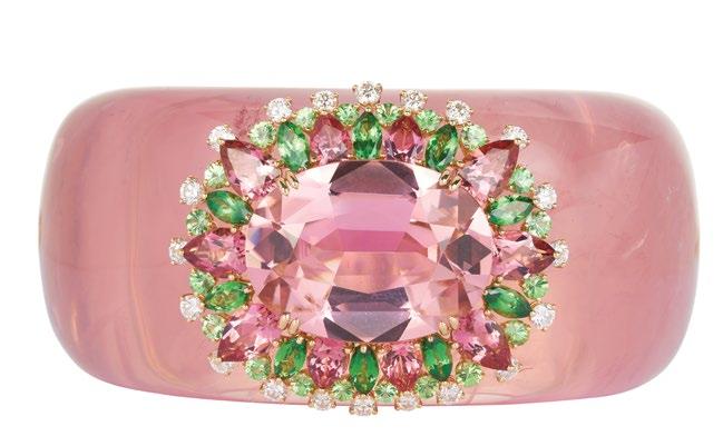 Cuff featuring pink tourmaline (43.04ct), rose quartz (1,097.75ct), diamonds, pink tourmalines and tsavorites. Crafted in 18-karat yellow gold.