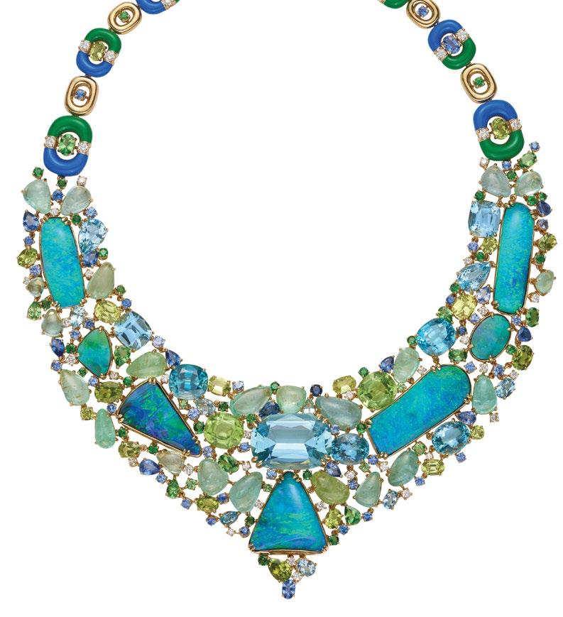Collier featuring Australian boulder opals (119.31ct), diamonds, Paraiba tourmalines, aquamarines, peridots, blue topazes, zircons, chrysoberyls, blue sapphires, tsavorites, and blue and green enamel. Crafted in 18-karat yellow gold.