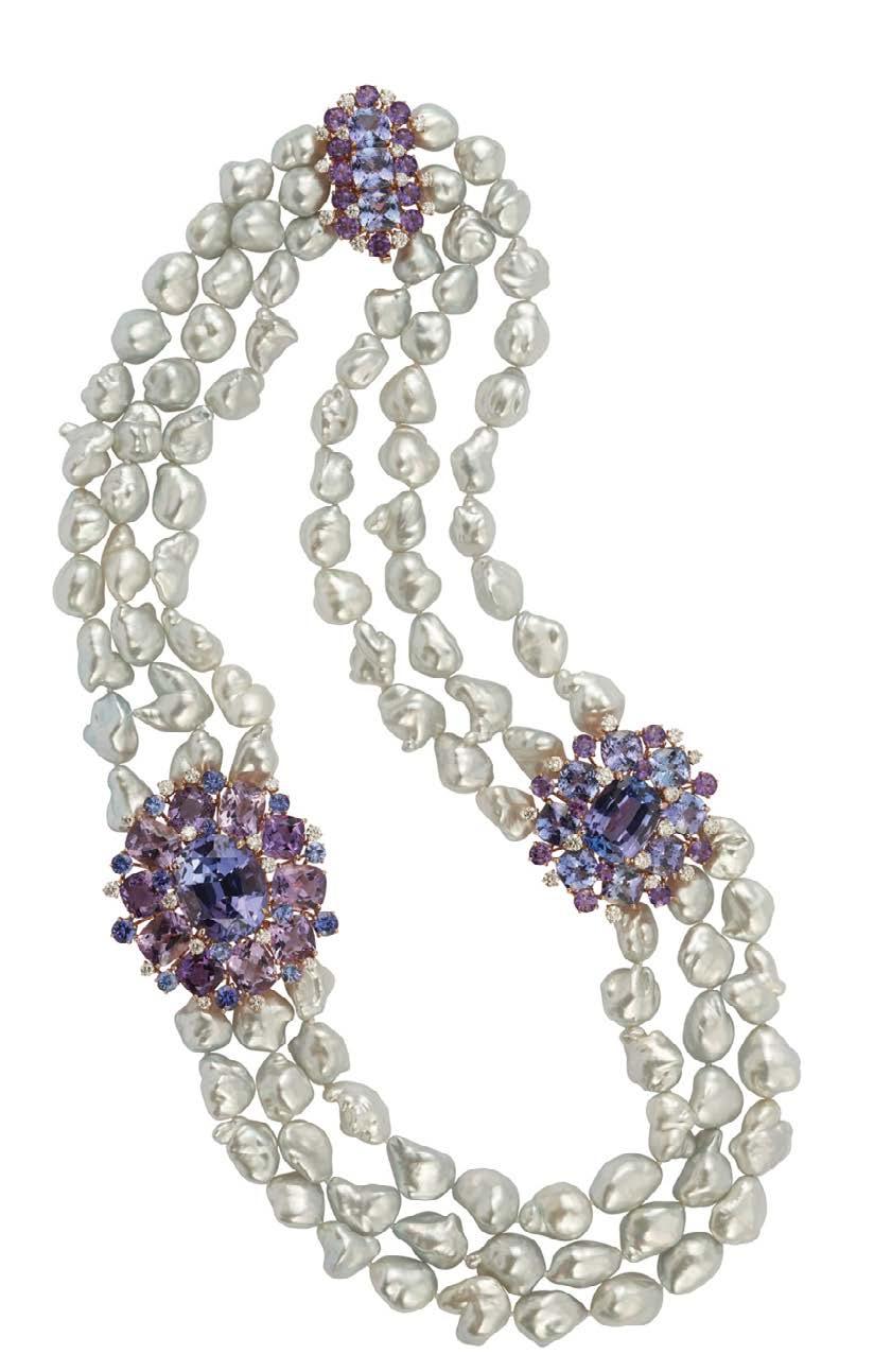 Necklace featuring tanzanites (54.36ct), Australian South Sea keshi pearls, diamonds, tanzanites, amethysts and rose de France. Crafted in 18-karat rose gold.