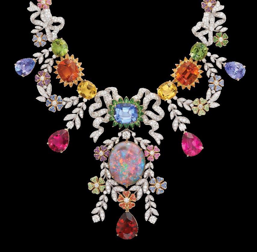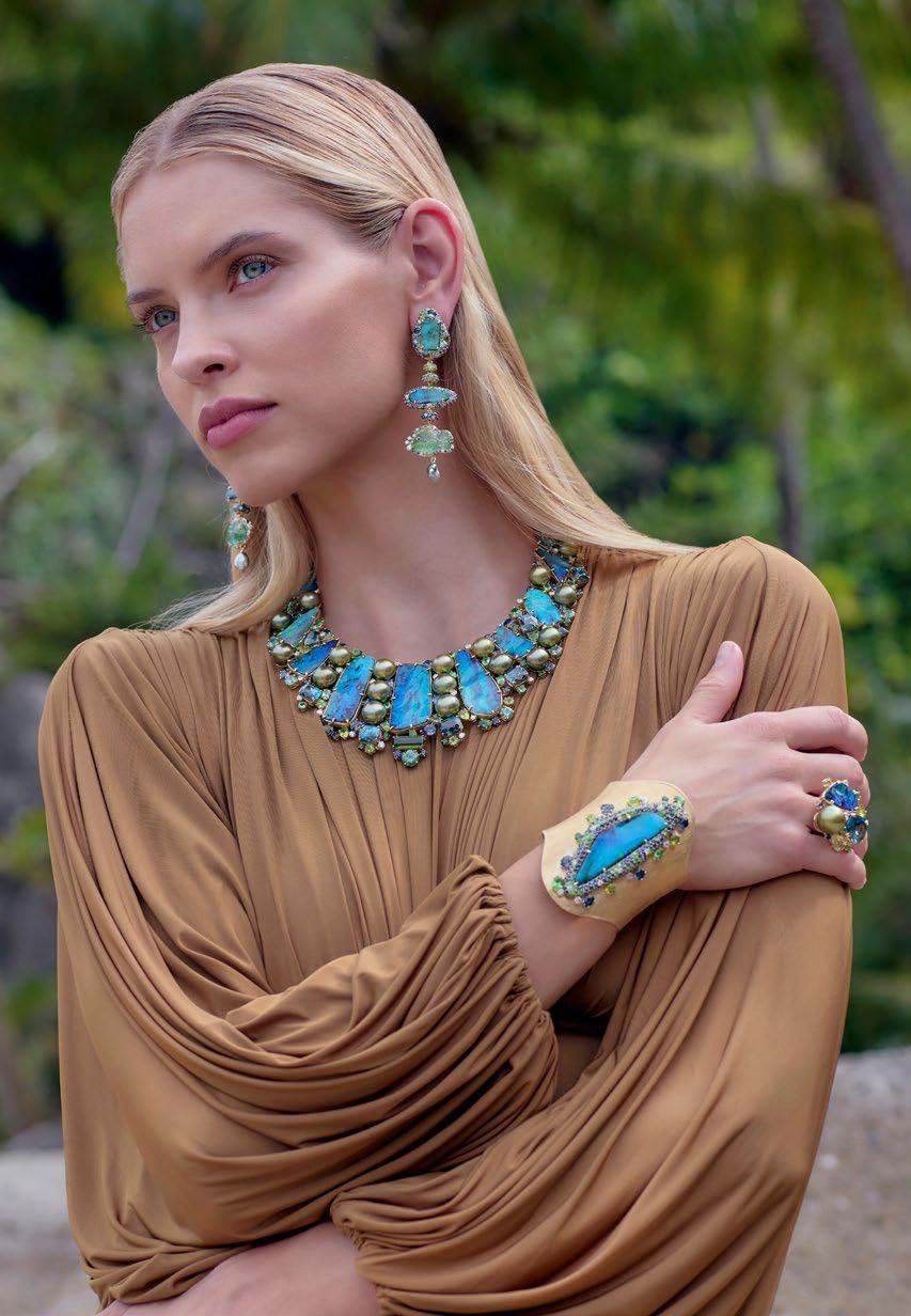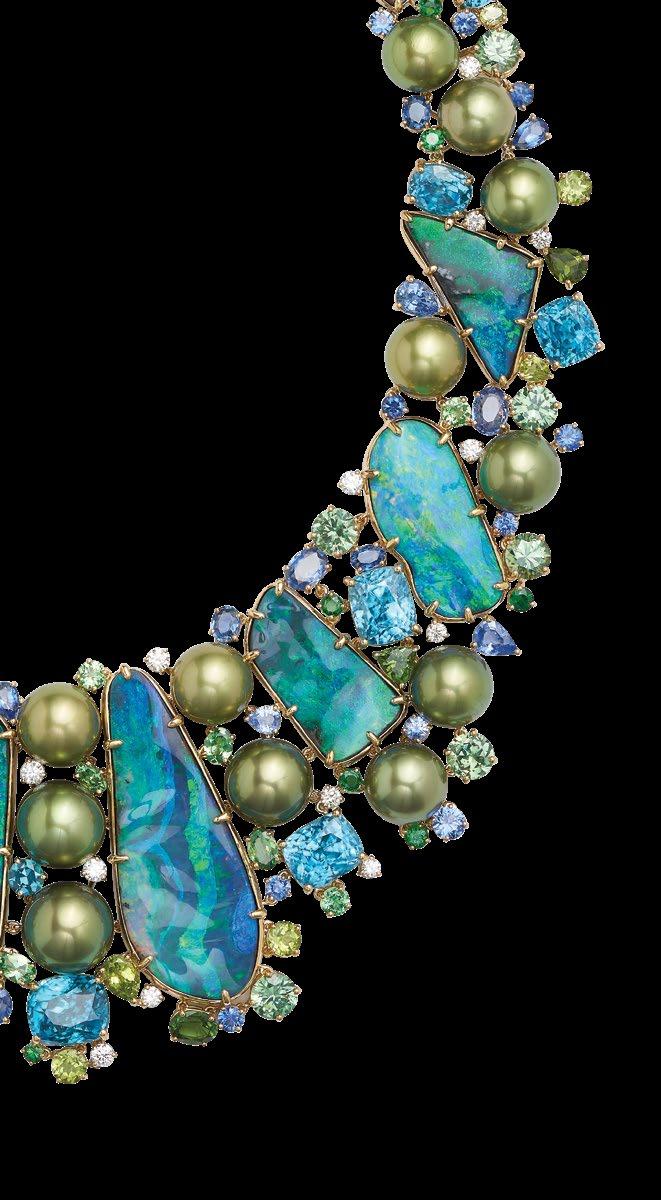 Collier featuring Australian boulder opals (38.35ct), pistachio pearls, diamonds, blue zircons, yellow beryls, Paraiba tourmalines, demantoids, green tourmalines, blue sapphires, tanzanites, tsavorites and peridots.