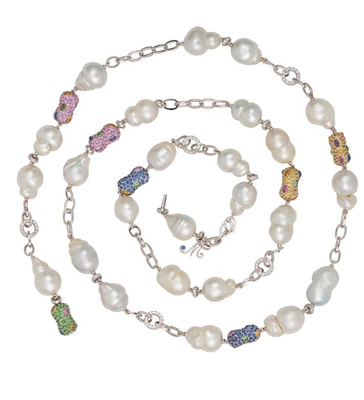 Necklace featuring Australian South Sea baroque pearls, diamonds, blue sapphires, yellow sapphires, pink sapphires and tsavorites.