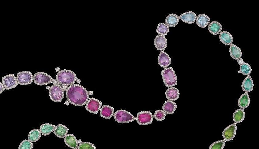 Collier created with gemstones of significant size including pink tourmaline (104.94ct), kunzite (57.40ct) and morganite (38.58ct), along with an exceptional assemblage of twenty-four large Australian South Sea baroque pearls measuring 16.5-23.5mm. The piece is further enhanced with three pink tourmalines (62 73ct) and two kunzites (34.21ct), with diamonds, blue sapphires, pink sapphires, purple sapphires, tsavorites and pink tourmalines.