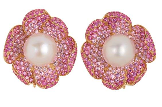 Earrings featuring Australian South Sea pearls, diamonds, pink sapphires, tsavorites, peridots and pink tourmalines.