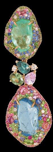 Earrings featuring large baroque gems of aquamarine, green tourmaline and peridot, set with diamonds, blue sapphires, pink sapphires, tsavorites, amethysts, rare blue zircons, kunzites, pink tourmalines and demantoids.