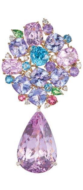 Earrings featuring kunzites (101.94ct), diamonds, tsavorites, blue topazes, pink tourmalines, amethysts, tanzanites, blue zircons and kunzites. Crafted in 18-karat yellow and white gold. 7.7cm x 4cm