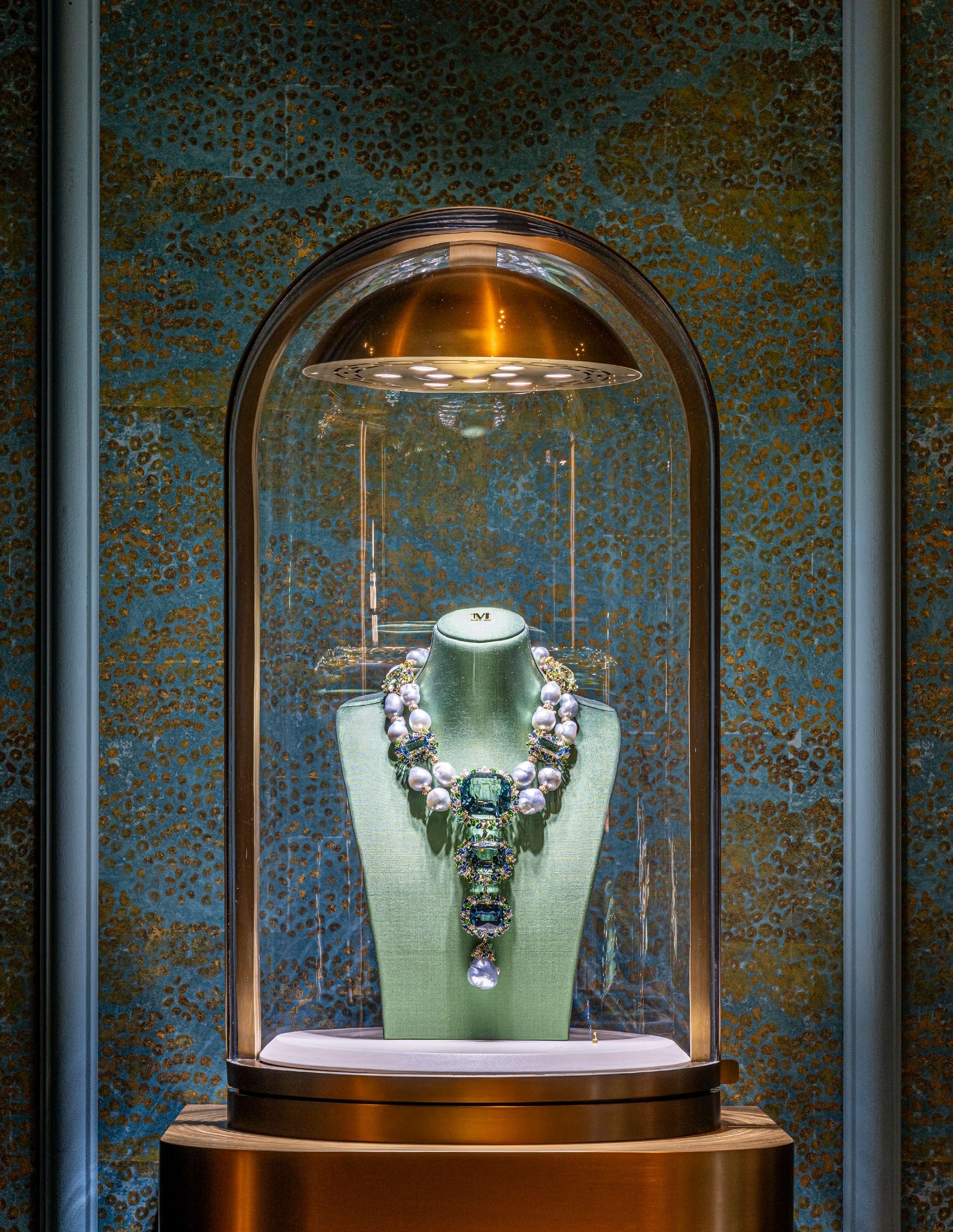 The collier is completed with two more aquamarines (32.44ct), two green tourmalines (15.88ct and 24.09ct), green beryl (22.47ct) along with diamonds, blue sapphires, green tourmalines, Paraiba tourmalines, aquamarines and tsavorites.