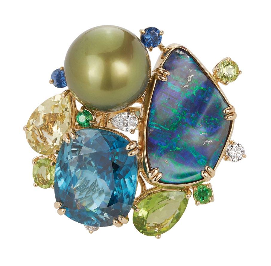 Ring featuring Australian boulder opal (10.71ct), blue zircon (18 06ct), pistachio pearl, diamonds, blue sapphires, tsavorites, lemon quartz and peridots. Crafted in 18-karat yellow gold.